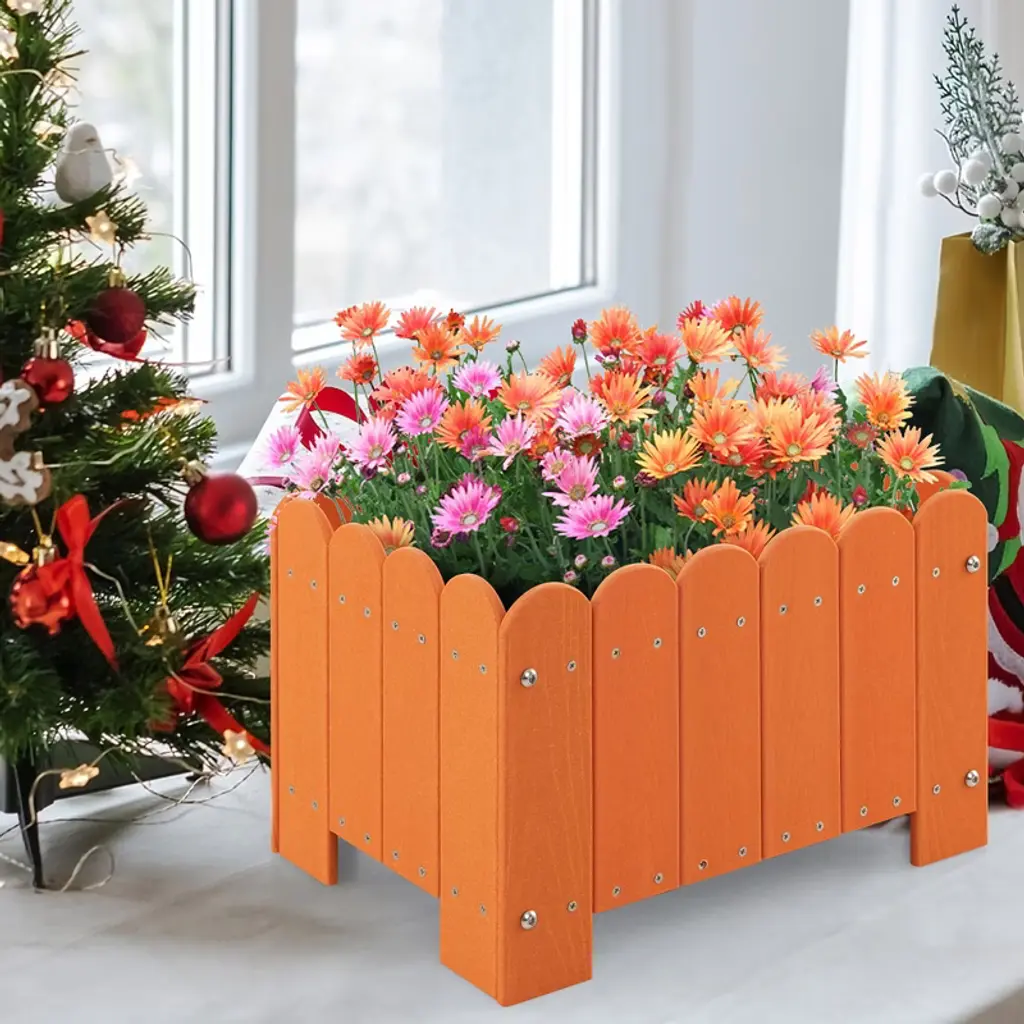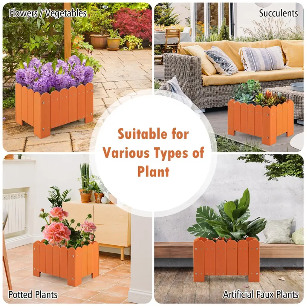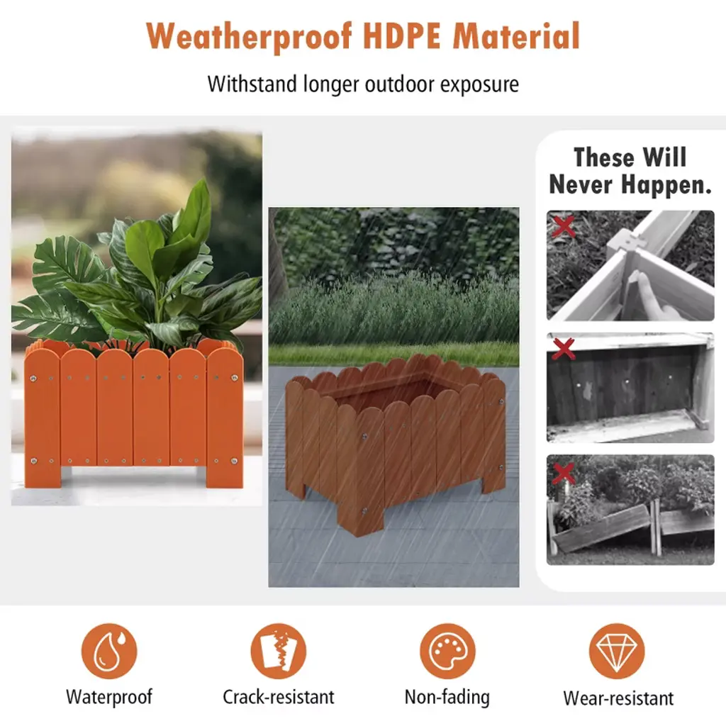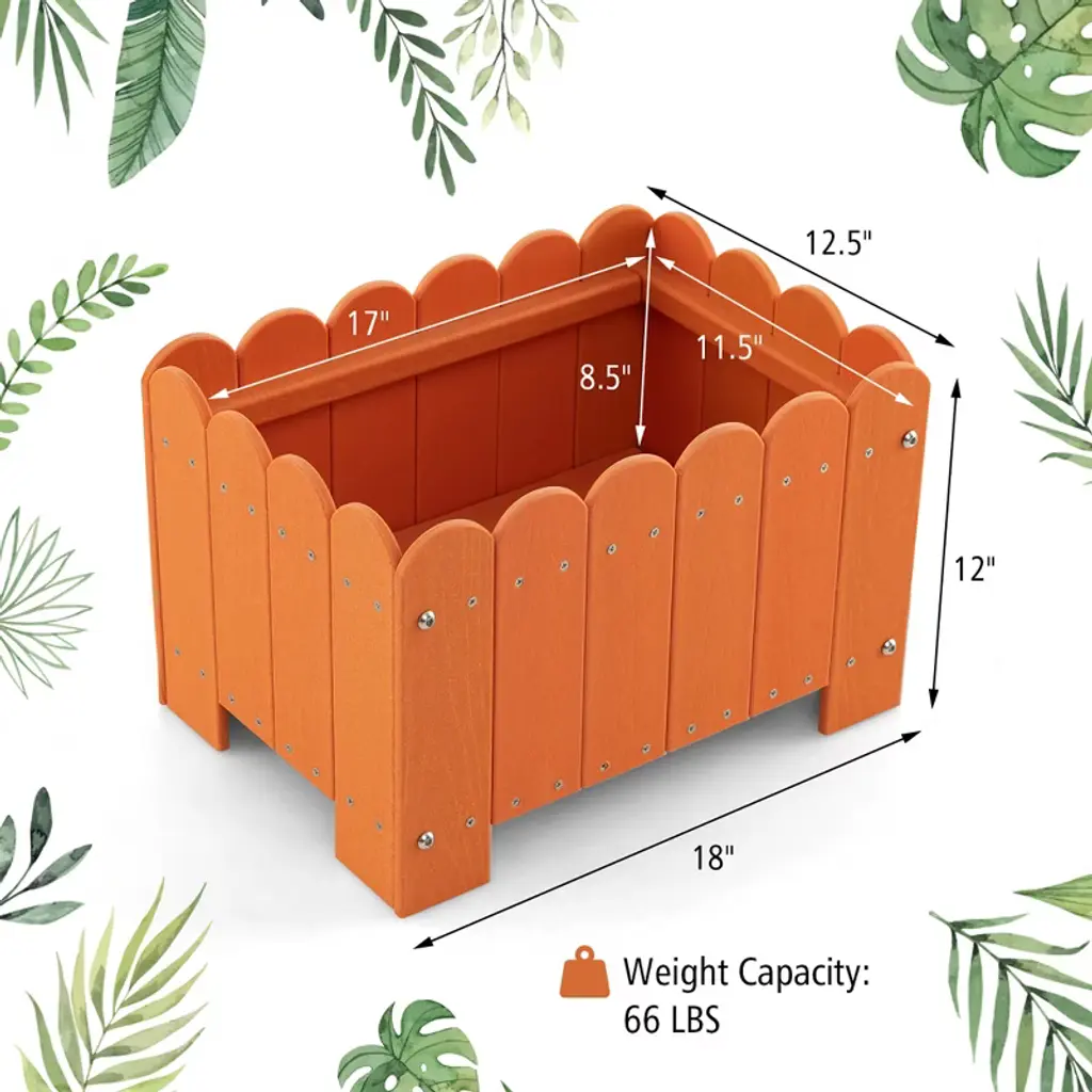Unleash you green thumb with our innovative garden bed. The outdoor plastic plant boxes will unleash your gardening imagination, which are perfect for showcasing your favorite potted plants, flowers, and herbs. Crafted with premium HDPE, these planter boxes are built to withstand the outdoor elements, making them a reliable choice for your gardening needs. Each set includes 2 planter boxes, allowing you to create a perfectly coordinated garden display. The simulated wood grain and fence design complement any outdoor setting and provides a rustic yet sophisticated look. Our planter boxes are expertly crafted, featuring a strong bottom base to ensure stability. The smart drainage system prevents water accumulation, promoting healthy root development.FeaturesTextured simulated wood grain adds natural beauty Easy to assemble with detailed instruction Suitable for various types of plantsSpecifications:Color: Grey / Orange Material: HDPE Overall Dimension: 18" x 12.5" x 12" (L x W x H) Interior Dimension: 17" x 11.5" x 8.5" (L x W x H) Max Load Capacity: 66 lbs Net Weight: 22 lbs