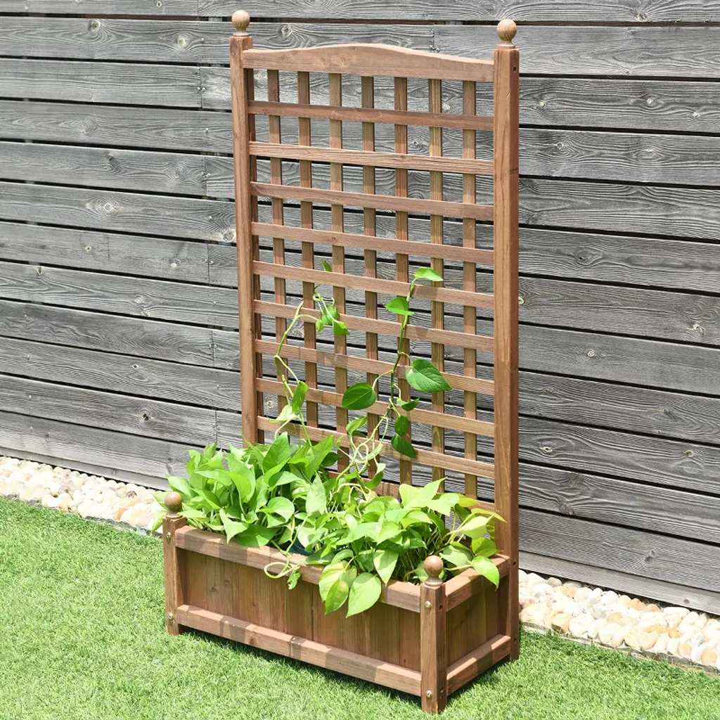 Our planter box with trellis is an excellent solution to make your house more lively and attractive. Made of 100% solid Chinese fir with Water-based paint, the planter is stable and long-lasting. Our planter with trellis can provide a large storage space for different planters'growing. It is also an ideal décor to yard, garden, patio and balcony. Worth having it!FeaturesMade of solid fir wood, stable and long-lastingThe surface is painted with water-based paint for using in wet spaceStable and not easy to shakeDesigned with drain hole to prevent rotting of rootsProvide a large storage space for different planters'growingSpecifications Material: Fir Wood Color: Dark Brown Product Size: 25"x11"x48"(WXDXH) Net Weight: 10.5 lbs Box Size: 23"x 8.5"x6"(L XW XH) Package include: 1x plant box with trellis