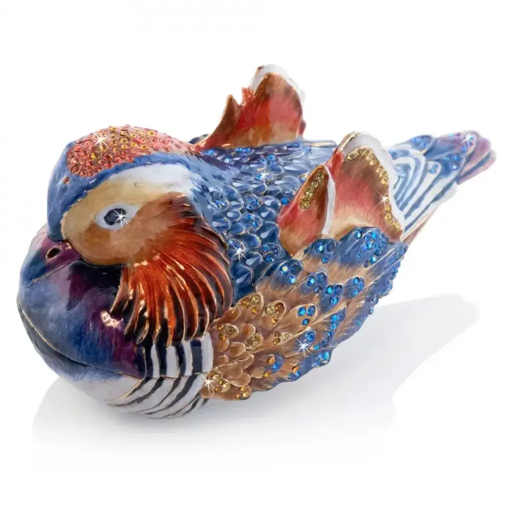 Hand-painted in incredible detail and a stunning array of colors, this Mandarin Duck box truly comes alive. Sparkling with 369 Swarovski crystals, lift its lid to reveal a clean white enamel center framed by a luxe 14K gold rim. Delivering drama, beauty and just the right amount of whimsy, this piece will be right at home as a conversation-starting statement piece for any space.