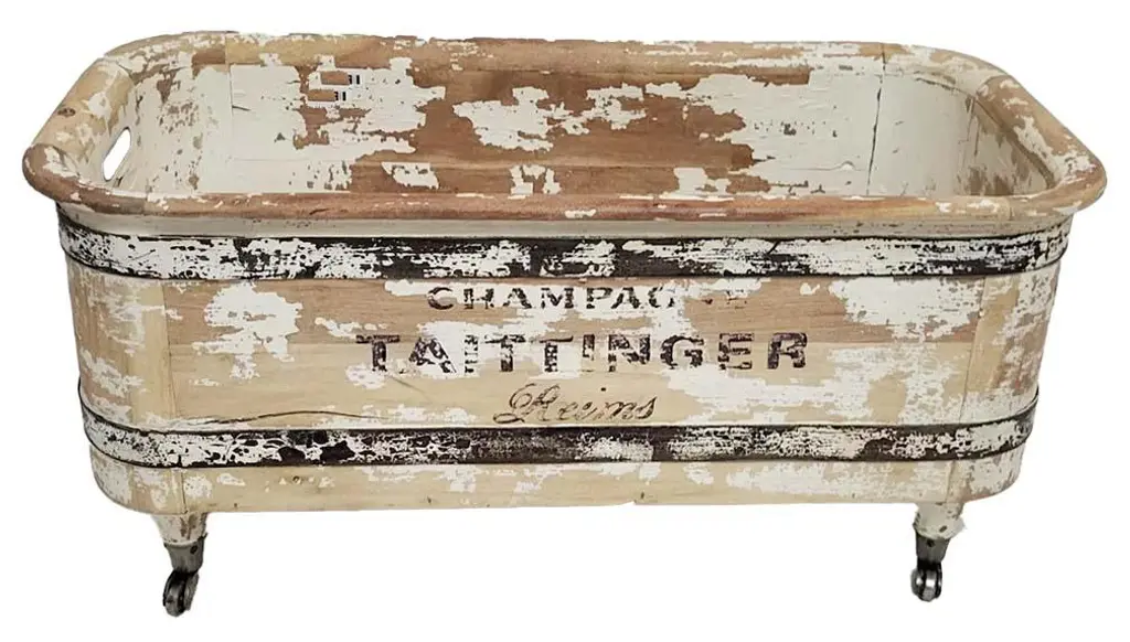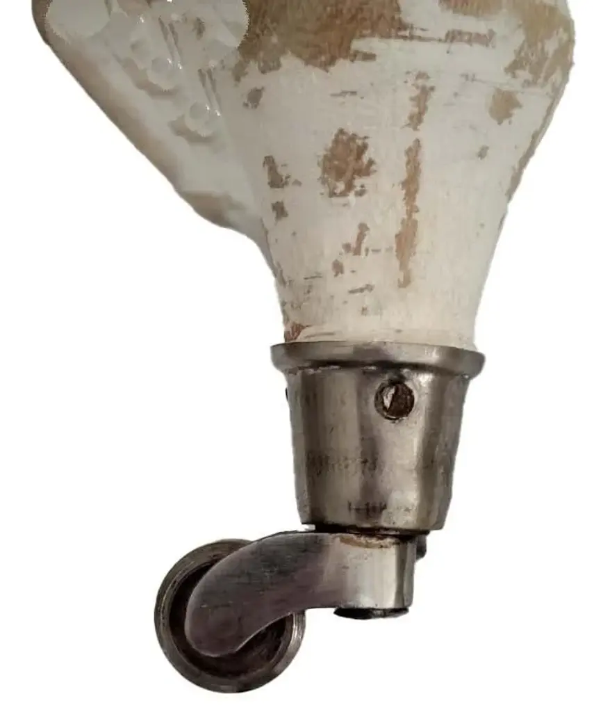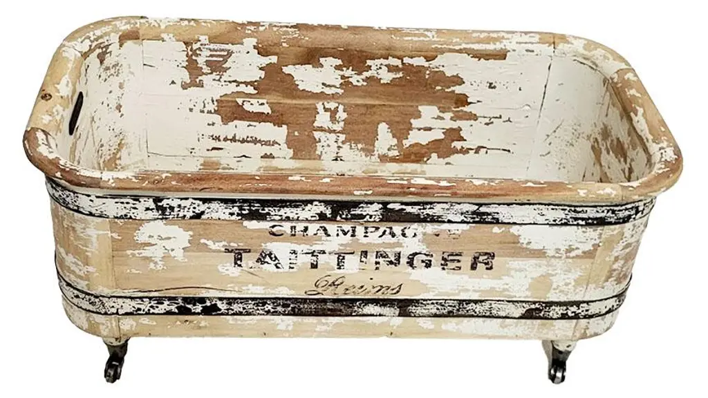 A very cool decorative piece -- appears to be a planter -- though there are so many possibilities. It is not lined and not recommended to hold water so faux plants are a consideration. It would be fun to store wine and champagne bottles, kitchen utensils, etc. There is one more available in my shop. They would make a great pair! 23" wide x 12" deep x 8" high without wheels, 11 1/2" high with wheels Origin and age is estimated
