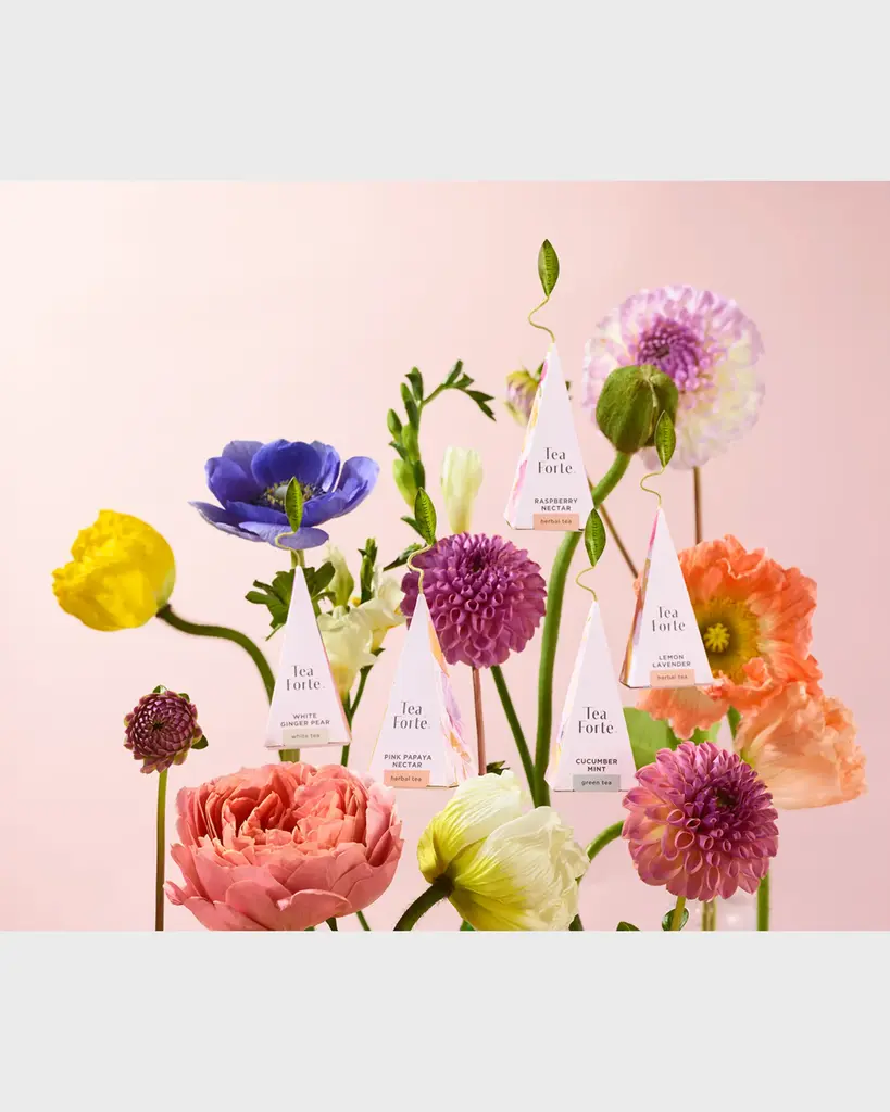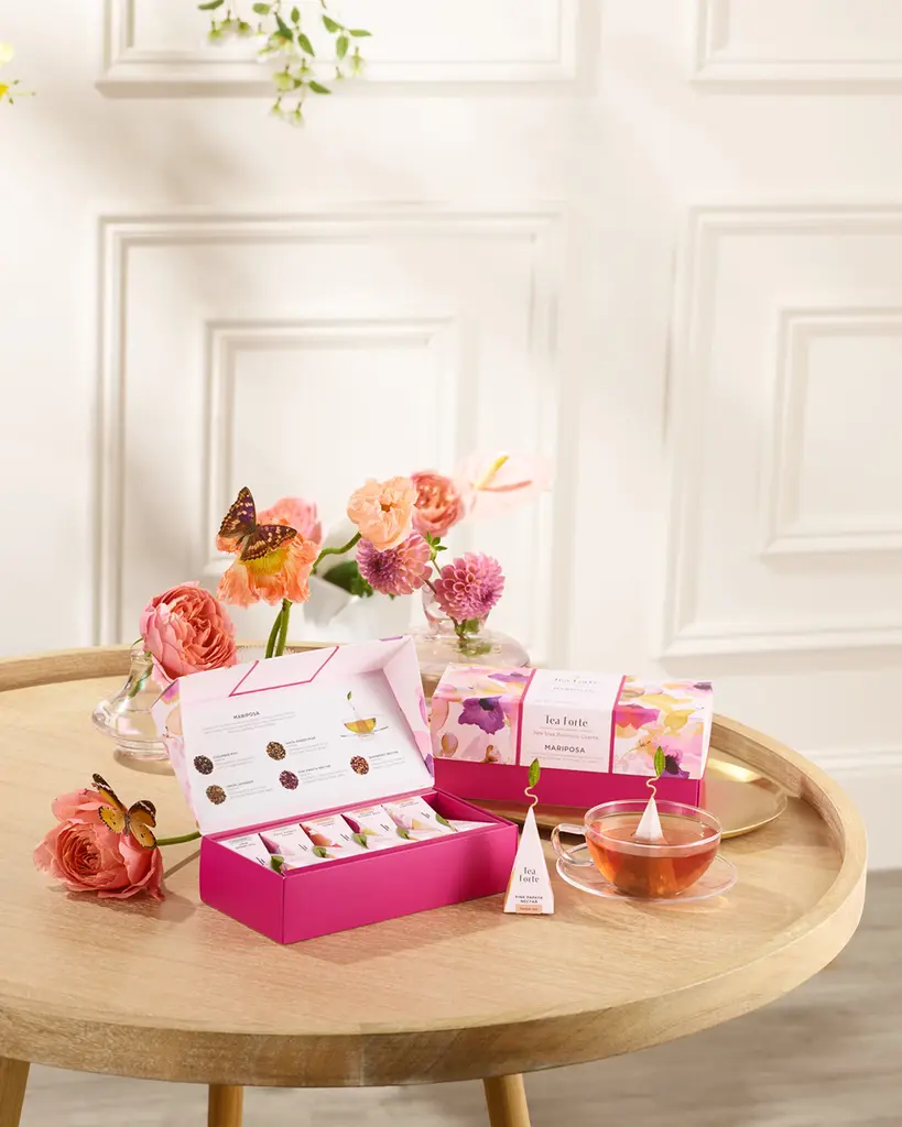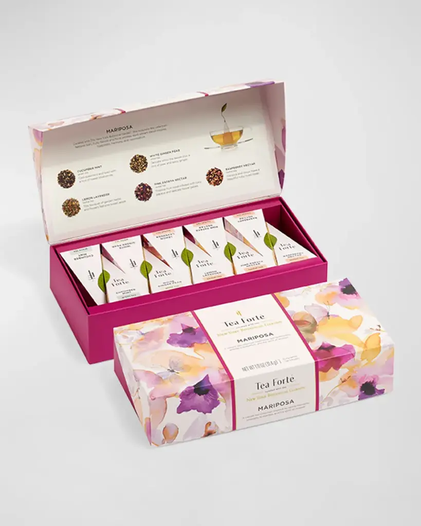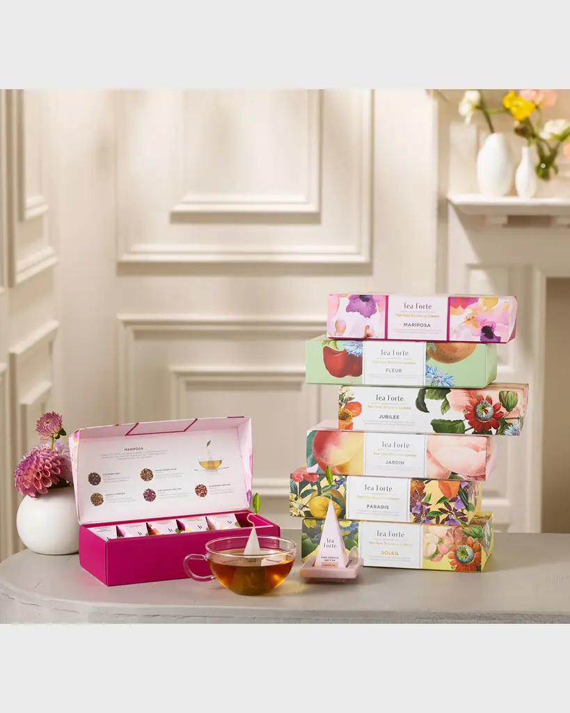 The Mariposa Collection is Tea Fortes's sixth-year collaboration with the New York Botanical Garden (NYBG). This exquisite tea collection features lush, fruity flavors and floral aromas; each vibrant blend inspires happiness, harmony, and rejuvenation. Includes 10 infusers, two of each: Cucumber Mint, White Ginger Pear, Lemon Lavender, Pink Papaya Nectar, Raspberry Nectar Approx. 8.4"W x 4.1"D x 2.1"T Shelf life: 3 years Made in Germany Contains allergens: No declared allergens undefined
