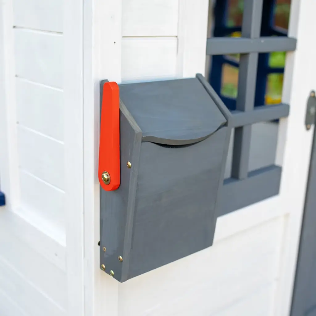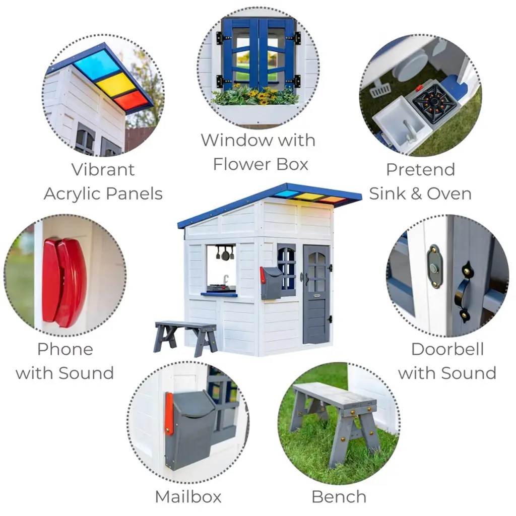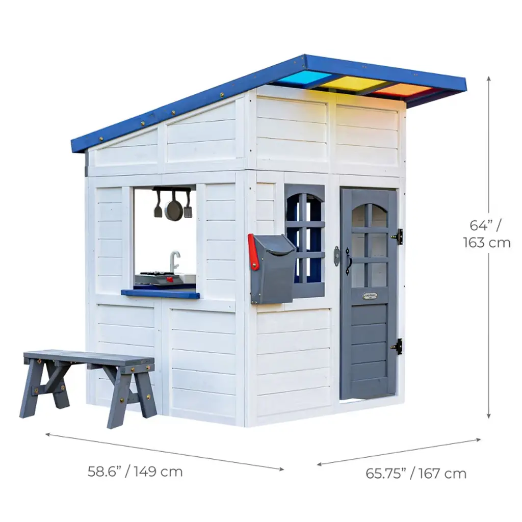 This gray wooden playhouse features a slanted roof with colorful panels that create a prism effect, a kitchen with sound effects, and features like a doorbell, mailbox, and doors and windows that open. Kids can enjoy the flower box and bench, too.