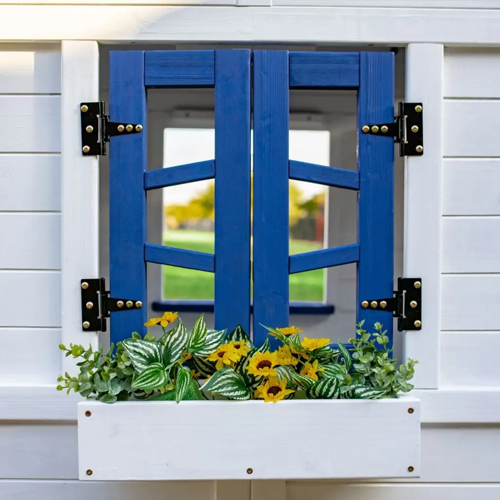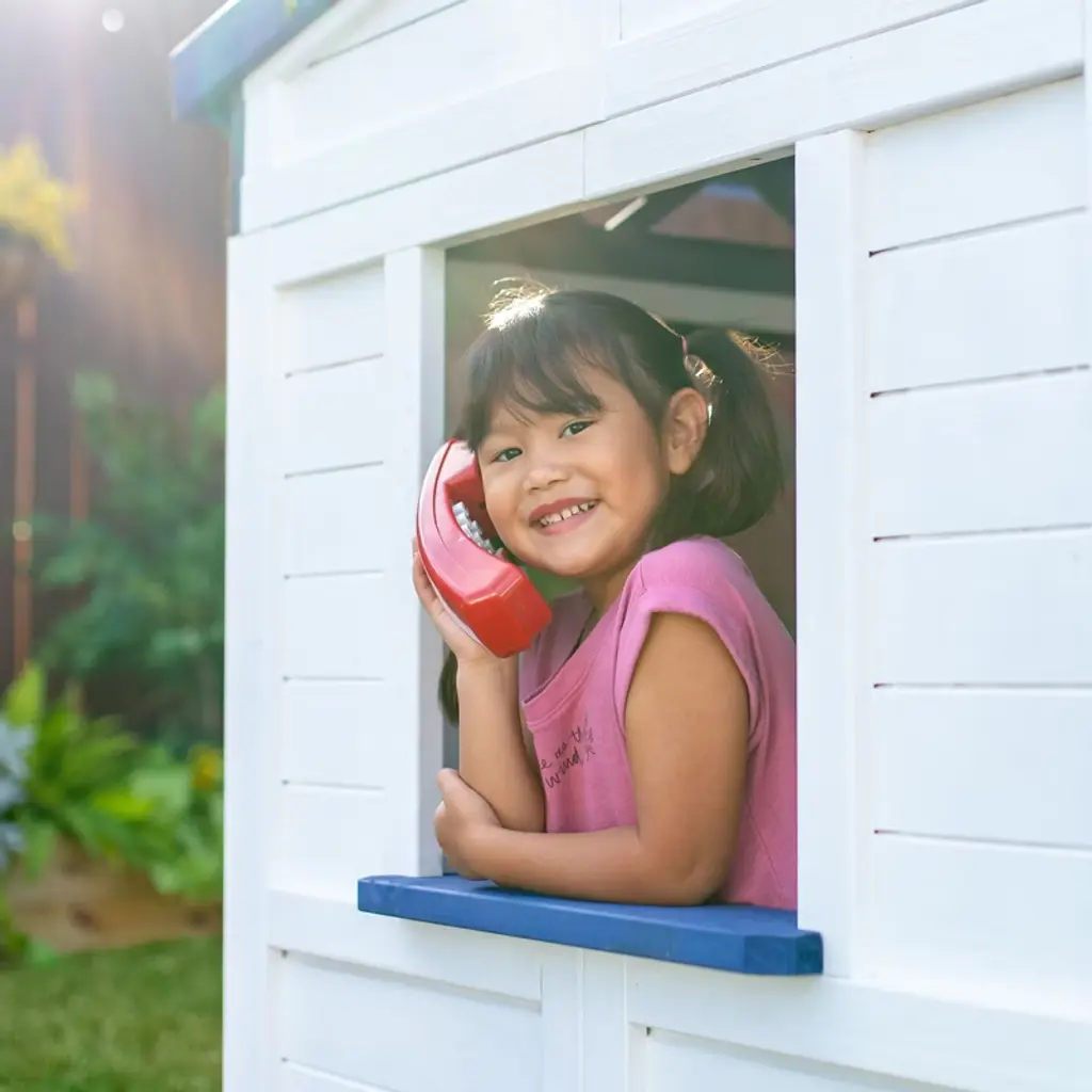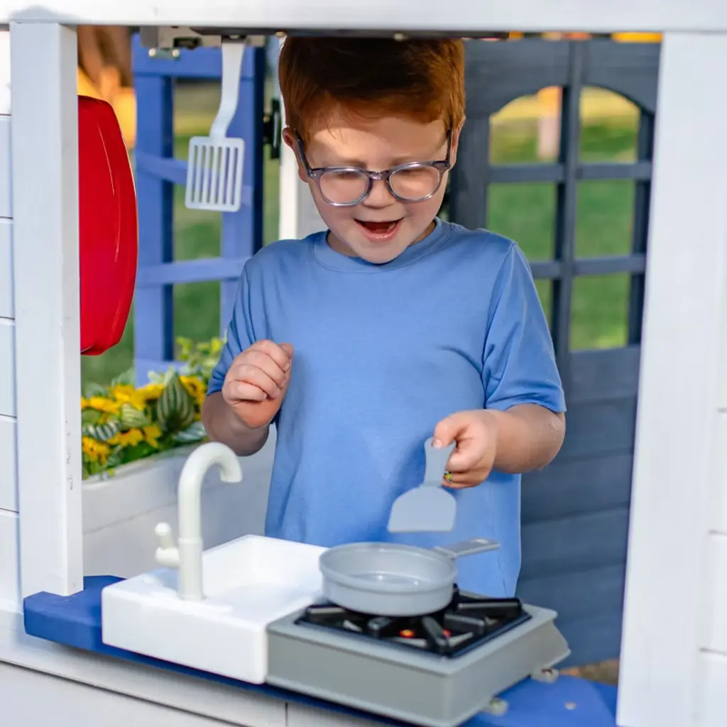 This gray wooden playhouse features a slanted roof with colorful panels that create a prism effect, a kitchen with sound effects, and features like a doorbell, mailbox, and doors and windows that open. Kids can enjoy the flower box and bench, too.