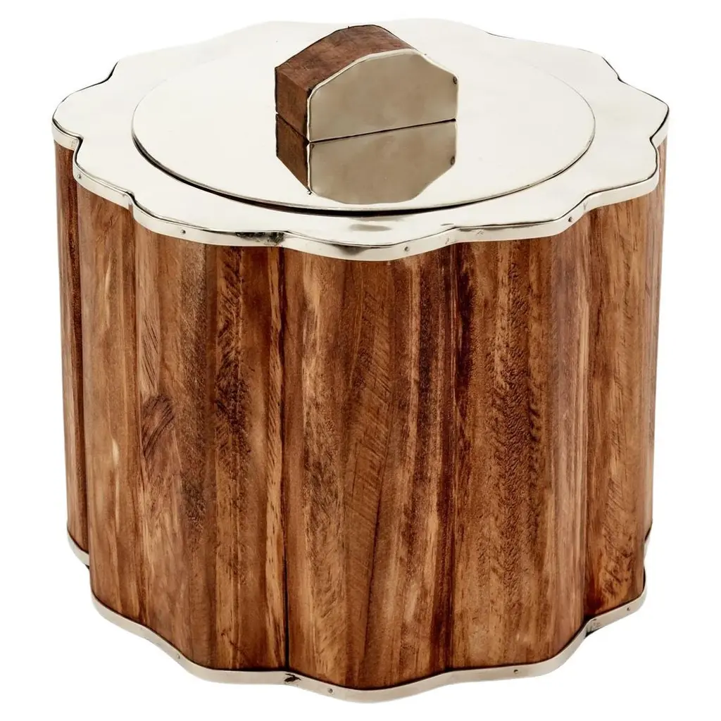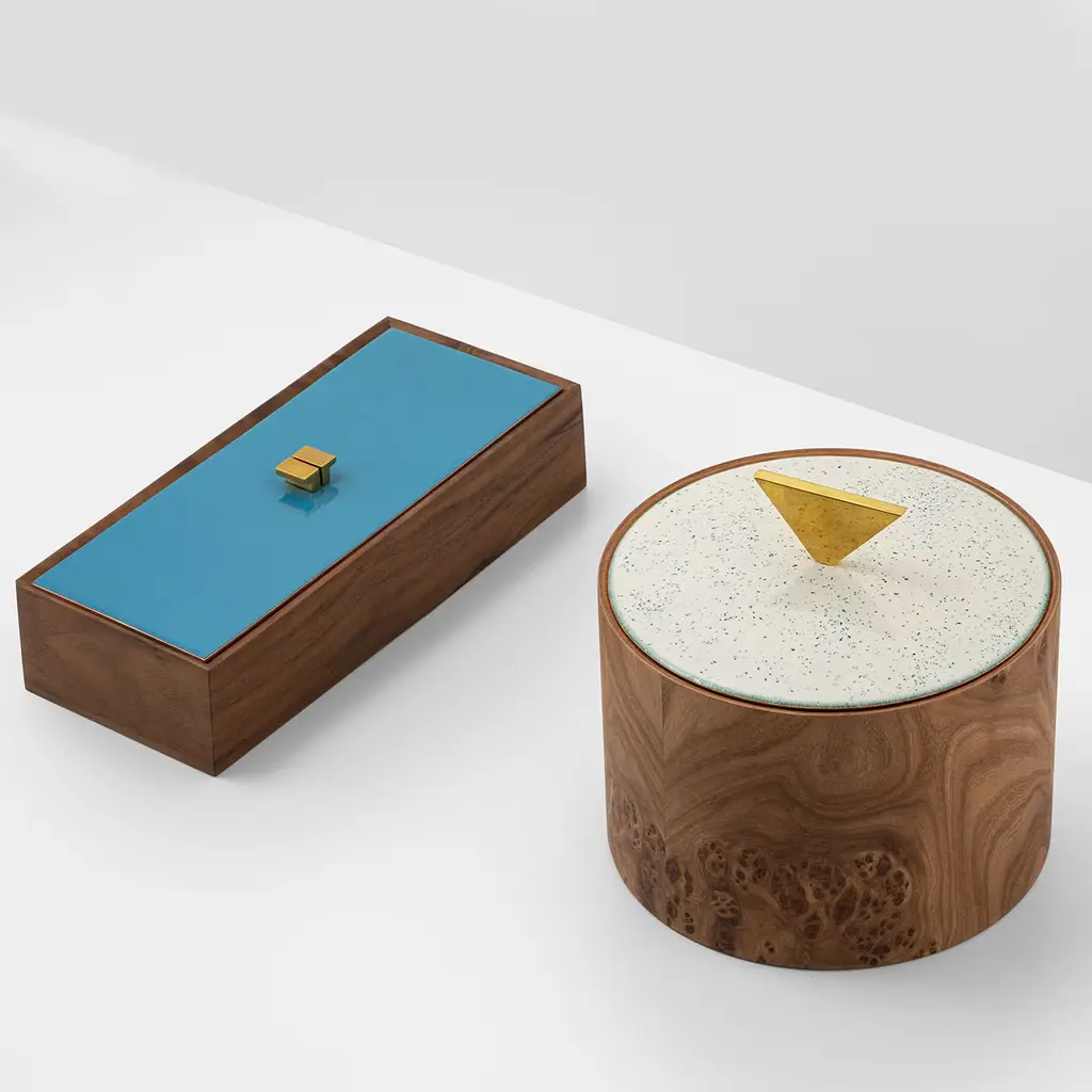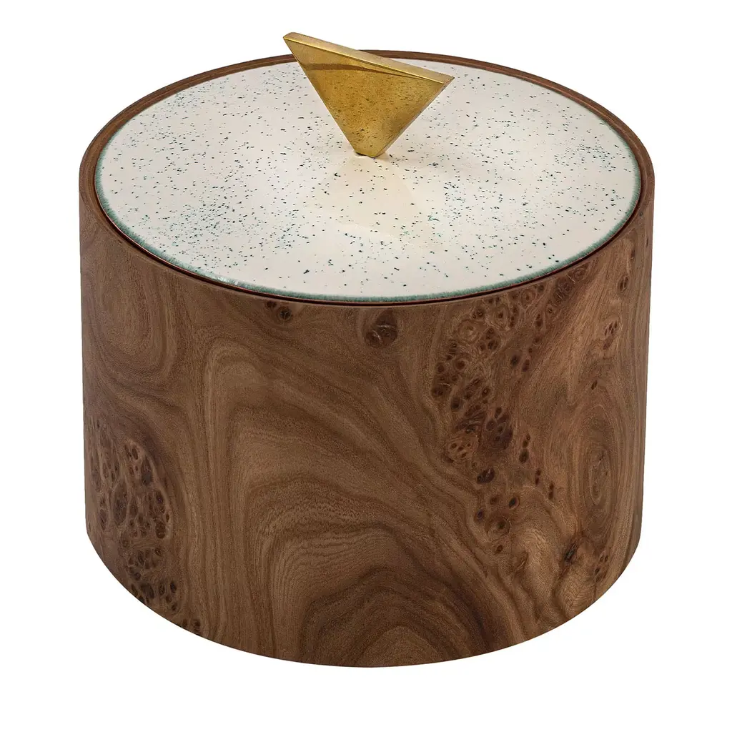 Cylindrical jewelry box made of elm root treated with bergamot oil. The stopper, concave on one side and convex on the other, is made of enameled copper. The Lid is foldable and it can be used from both sides, one characterized by a triangular knob and the other by a ring, both in brass.