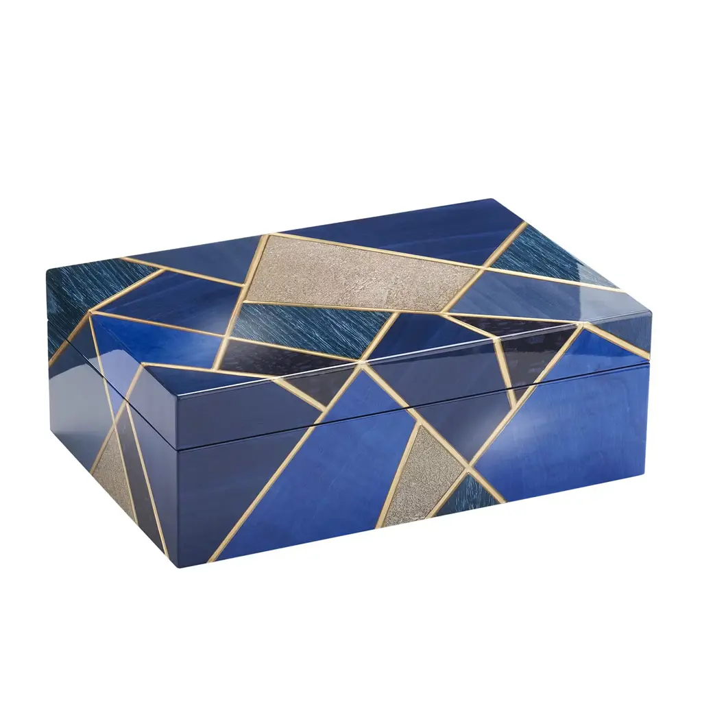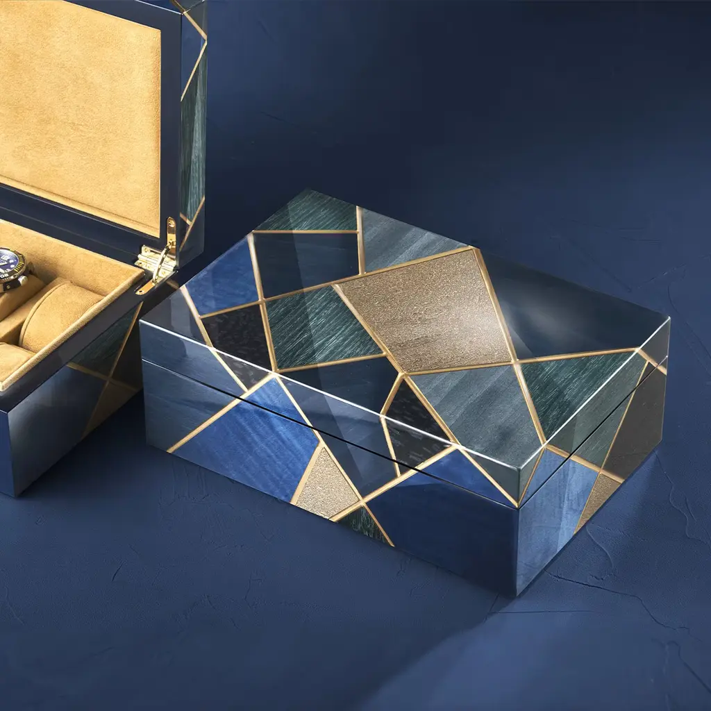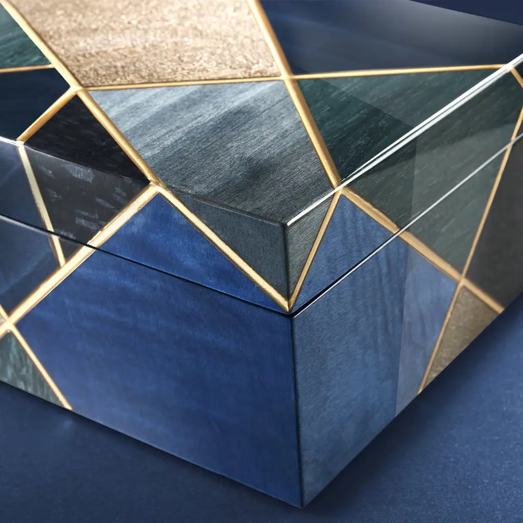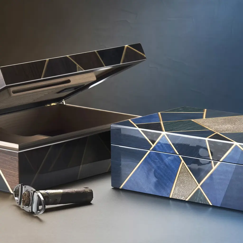 This singular design for collectors will host up to 18 pens in its two sleek trays lined in beige Alcantara. A geometric-style handmade inlay - where bolivar, ash, briar, rosewood, and ebony are combined and finished in a selection of blue shades - enliven the outside, sealed by geometric grooves filled with gold. It was polished and brushed for a mirrored look.