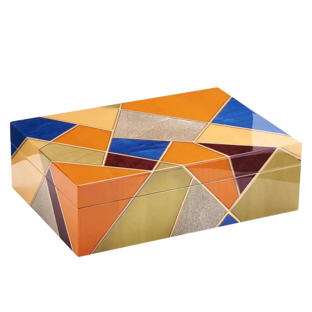This Cigar Box is a sophisticated piece crafted from exquisite wood and featuring a meticulously handcrafted inlay. Enhanced by metallic reflections and an elegant gold finish, this piece embodies a stunning array of premium hardwoods, including burl, ebony, rosewood, ash, and bolivar. The interior is lined with aromatic Spanish cedar, providing an optimal environment for humidity control and preserving the quality of cigars. It includes a movable divider allowing for customizable storage of up to 50 cigars. A digital hygrometer is integrated, ensuring precise monitoring of the humidity levels, while a humidifier maintains the perfect storage conditions.