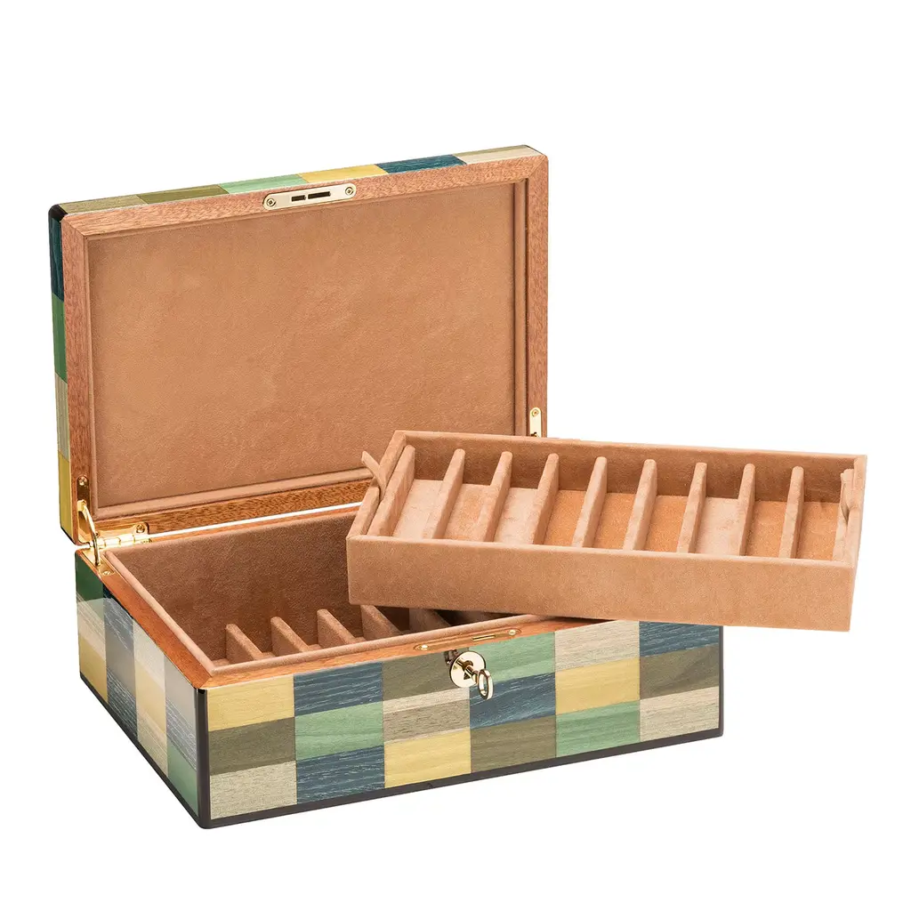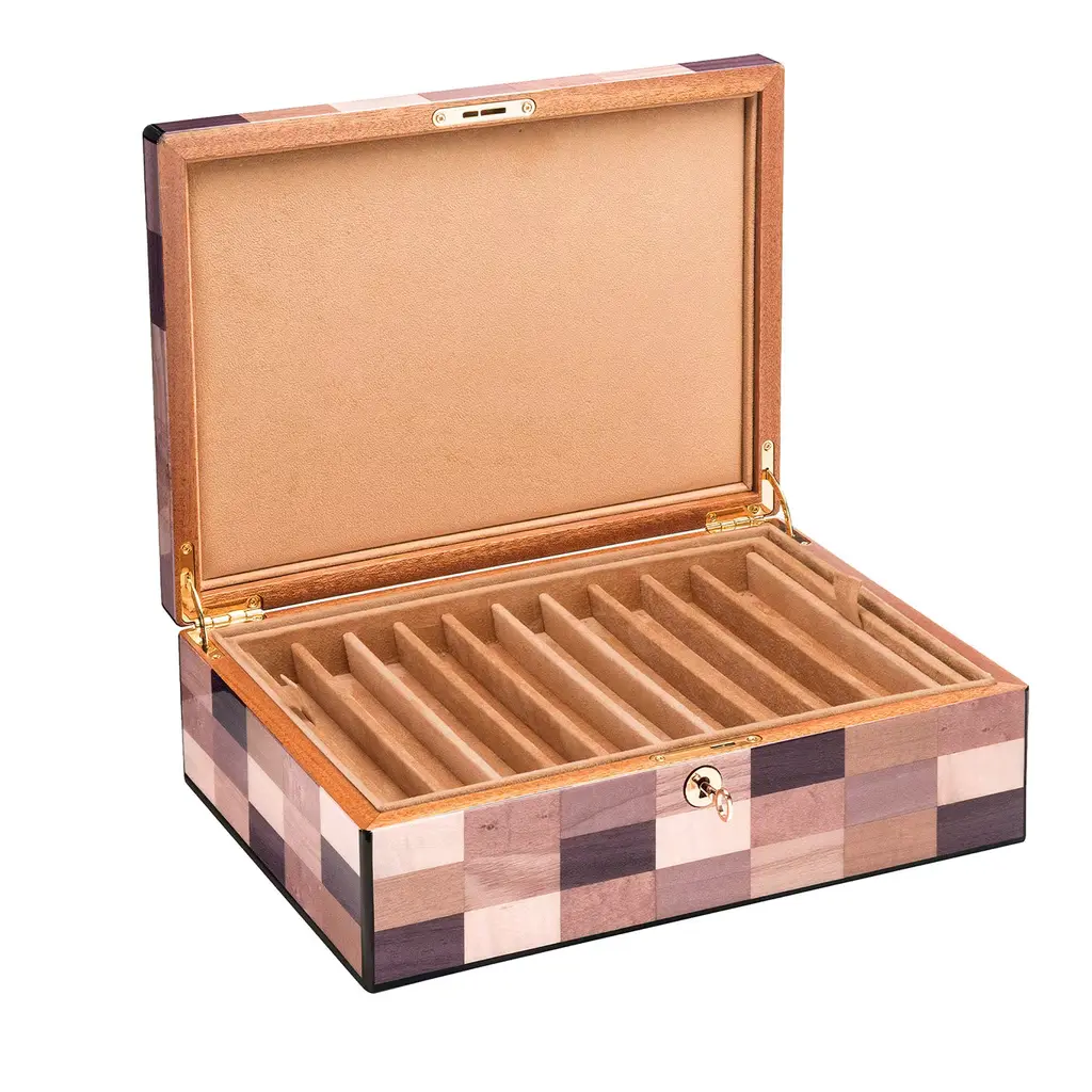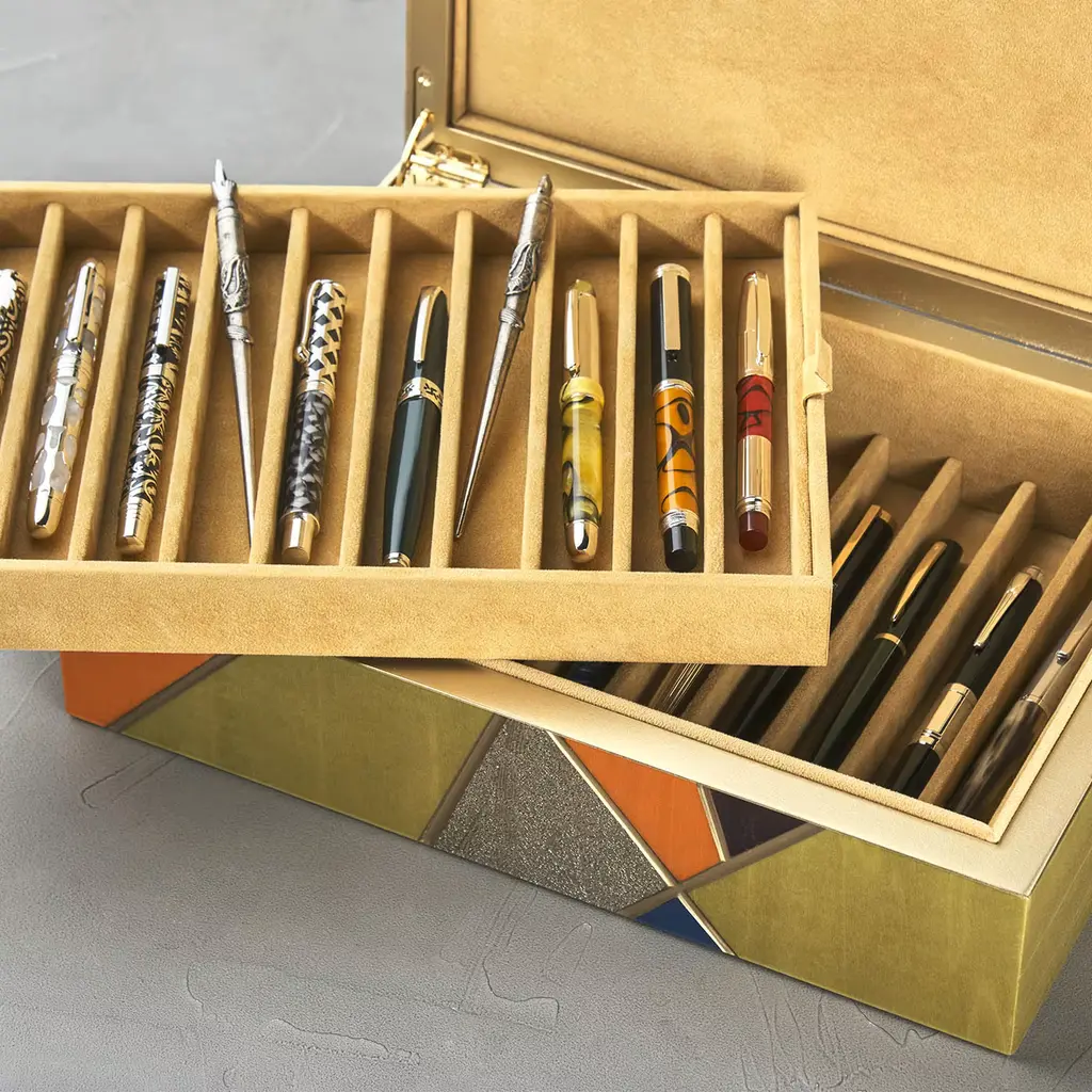 This luxurious Tellux Sibilla pen box boasts a stunning geometric inlay crafted from fine woods, including ebony, rosewood, ash, and bolivar, accentuated by elegant gold contours. The interior is lined with premium Alcantara, providing a sophisticated backdrop for the organization of pens. Designed with practicality in mind, this piece features two spacious shelves, each capable of accommodating up to eight writing instruments. The meticulous polishing and brushing process achieves a mirror-like finish, adding a touch of opulence to any setting. A larger version, designed to hold 20 pens, is also available. Please contact the Concierge for additional information.