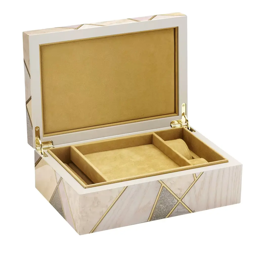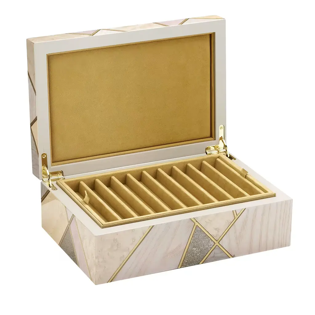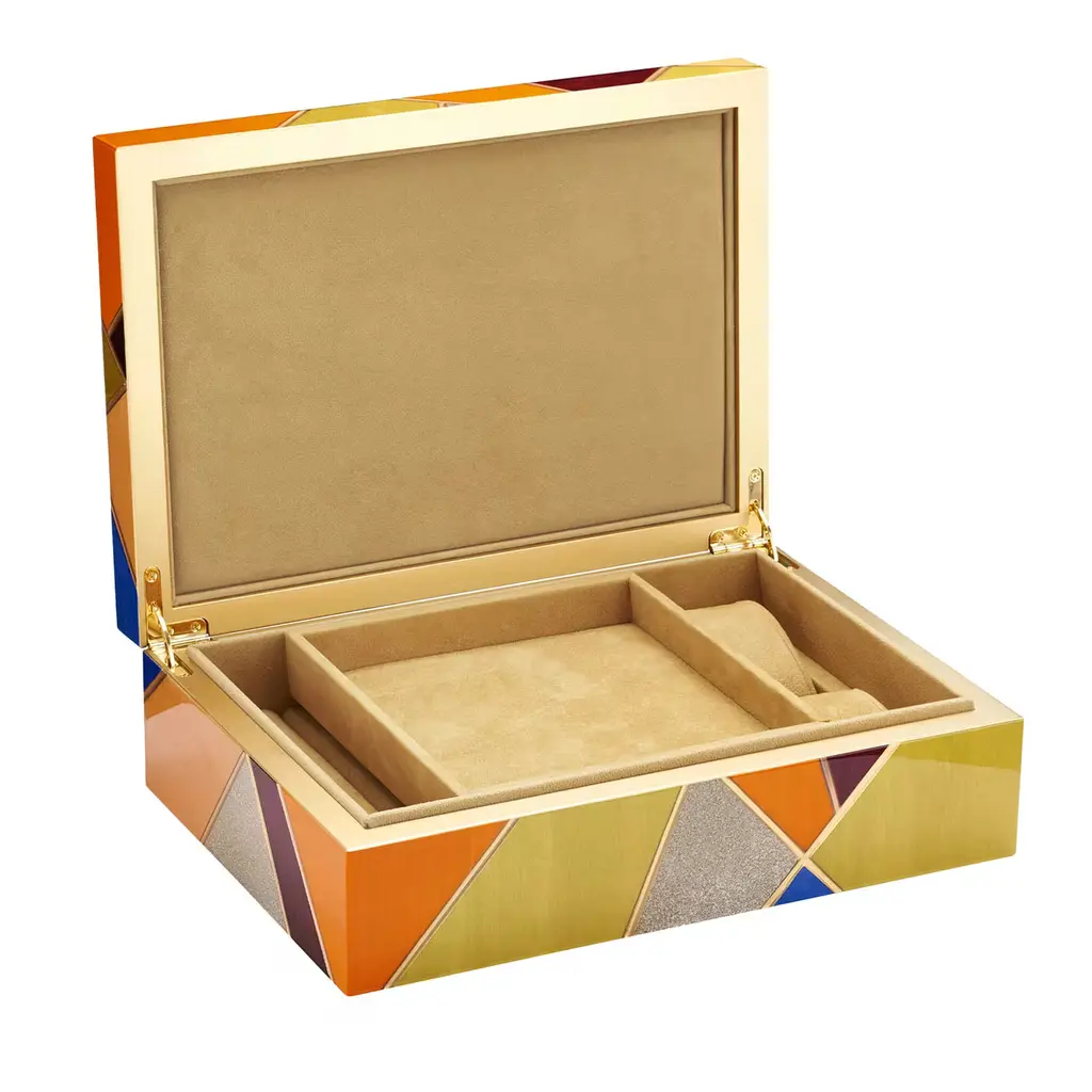 This luxurious Tellux Sibilla pen box boasts a stunning geometric inlay crafted from fine woods, including ebony, rosewood, ash, and bolivar, accentuated by elegant gold contours. The interior is lined with premium Alcantara, providing a sophisticated backdrop for the organization of pens. Designed with practicality in mind, this piece features two spacious shelves, each capable of accommodating up to eight writing instruments. The meticulous polishing and brushing process achieves a mirror-like finish, adding a touch of opulence to any setting. A larger version, designed to hold 20 pens, is also available. Please contact the Concierge for additional information.