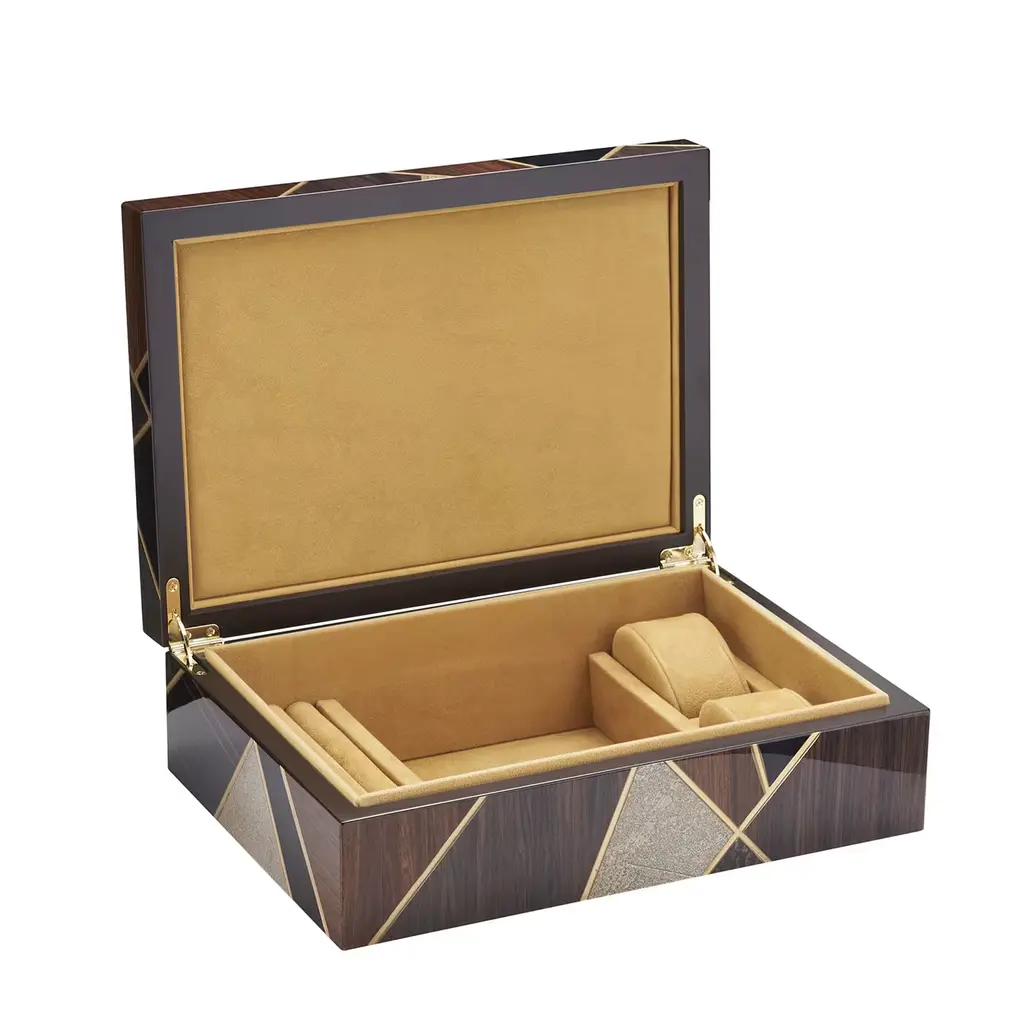 The Tellux Vulcano Jewelry Box features a distinctive design that showcases a harmonious blend of meticulously crafted geometric patterns. This exquisite piece combines various types of fine woods, including bolivar, rosewood, ebony, and ash, offering both durability and elegance. The exterior is finished with a brushed and polished look, achieving a stunning mirror-like sheen, while the intricate golden profiles enhance its luxurious appeal. Inside, this piece is lined with soft beige Alcantara. This jewelry box serves as an ideal addition to any sophisticated home décor, seamlessly marrying functionality with artful design.