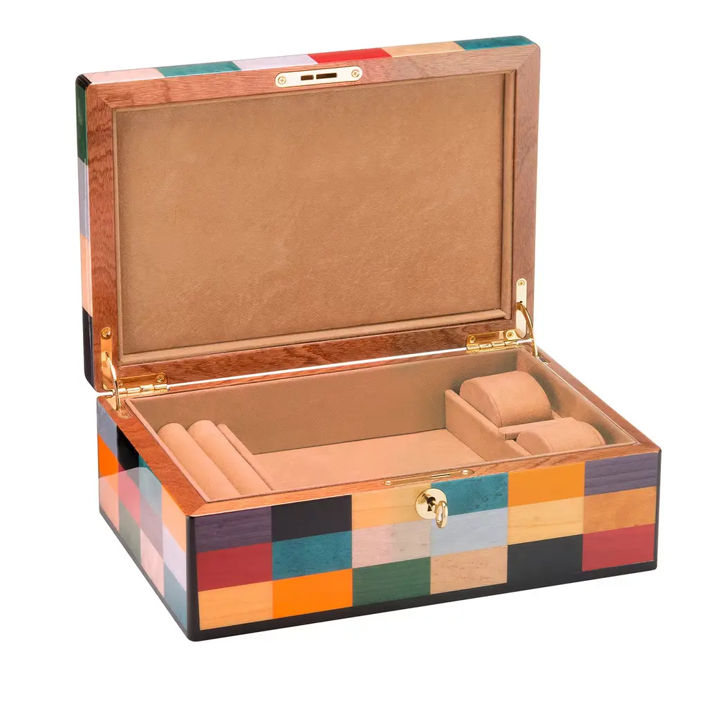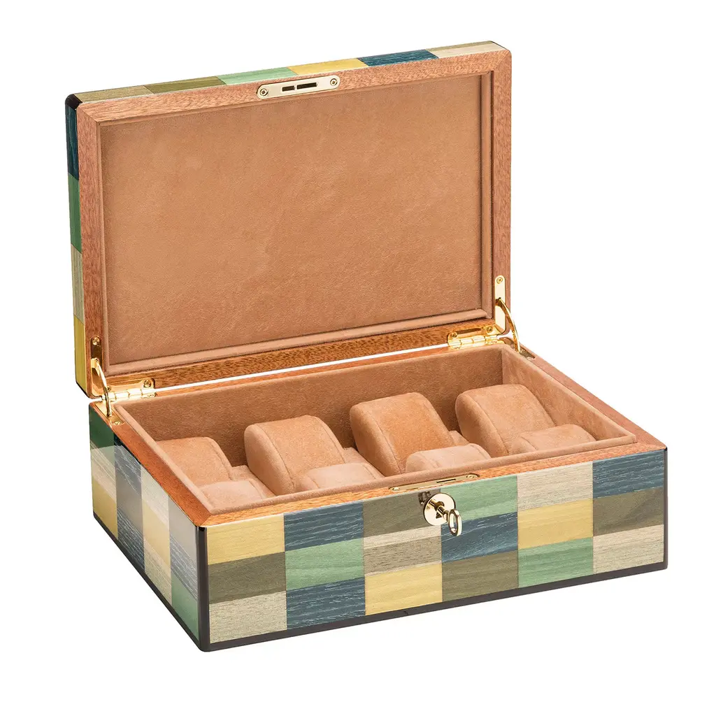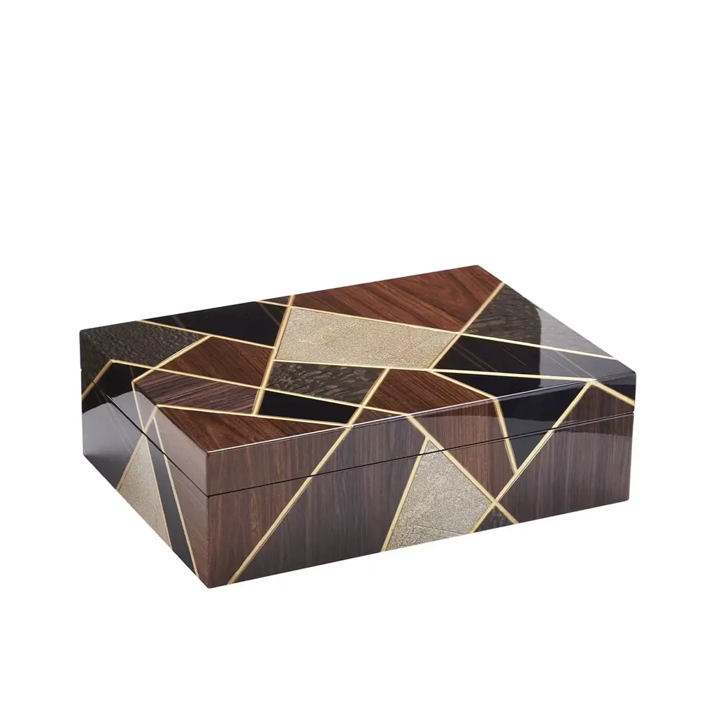 This exquisite piece features a meticulously crafted geometric inlay, showcasing a harmonious blend of luxurious woods, including bolivar, rosewood, ebony, and ash. The exterior boasts a brushed and polished finish, achieving a stunning mirrored effect enhanced by striking golden profiles. Inside, the box is lined with soft beige alcantara, providing a plush environment for your finest timepieces. Capable of accommodating up to eight watches, this watch box not only serves a functional purpose but also elevates any décor with its sophisticated design. Ideal to appreciate beauty and utility in any storage solution.