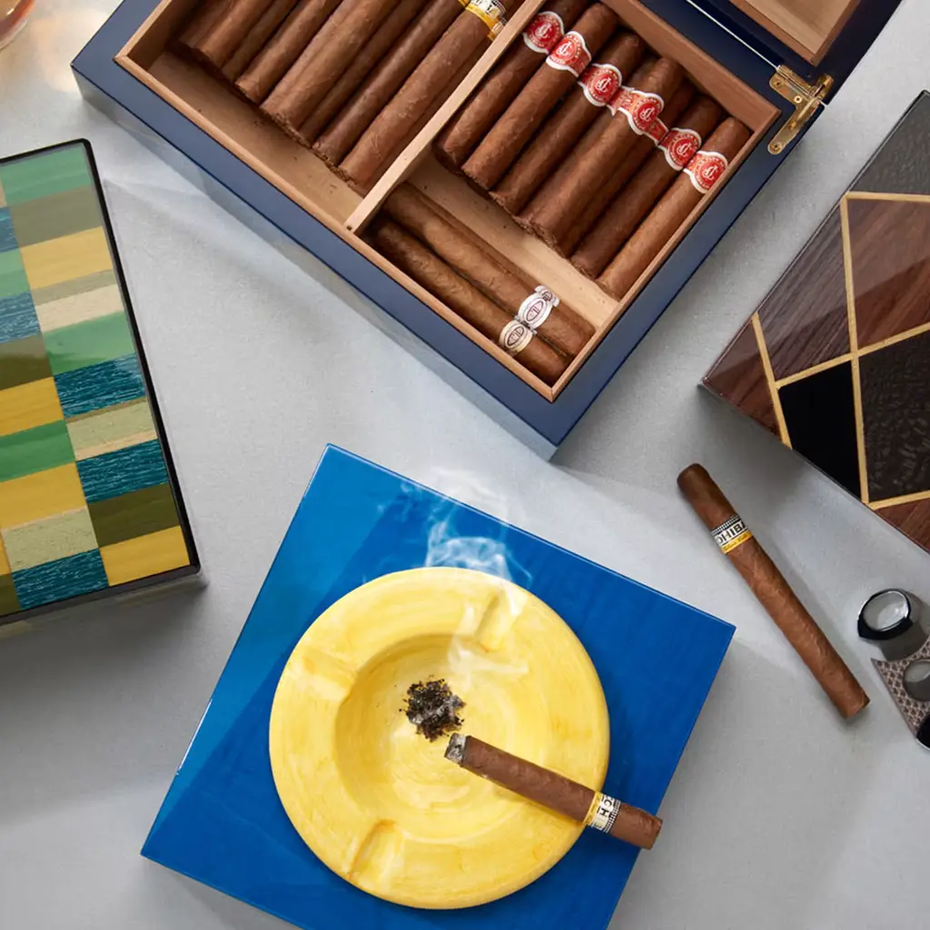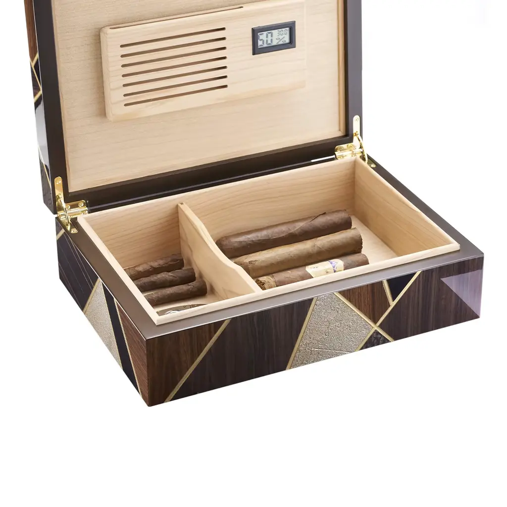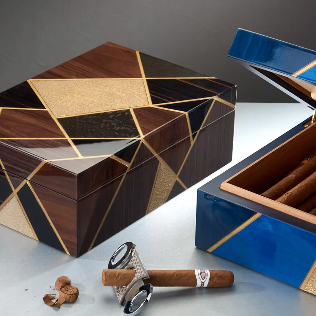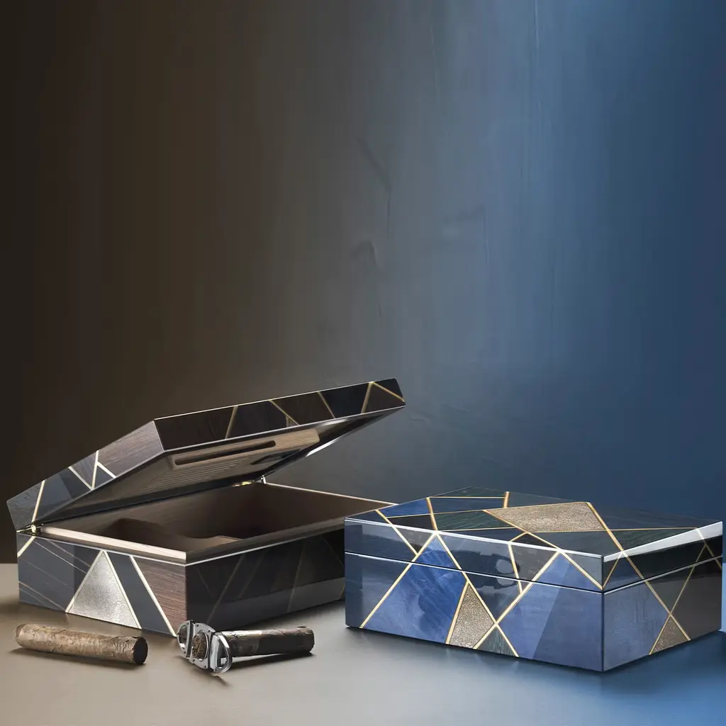 A handmade, geometric-style inlaid pattern juxtaposing prized bolivar, briar, rosewood, ebony, and ash lends this cigar box its allure of objet d'art. Crossed by hand-poured gold profiles, the exterior is brushed and polished up to a mirrored finish, while the interior in Spanish cedar (with movable divider) hosts a maximum of 50 cigars. Slot for housing Boveda® humidity-control packet and hygrometer are incorporated.
