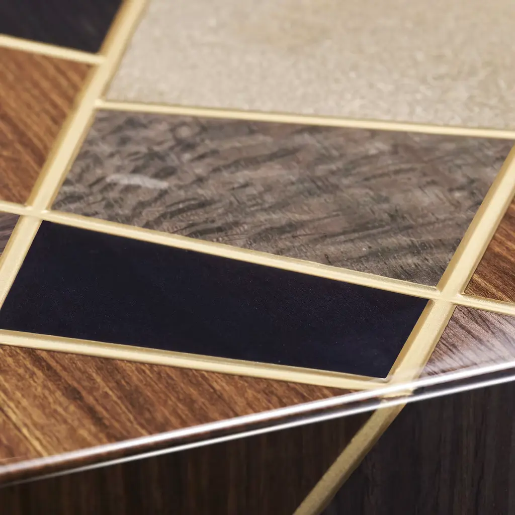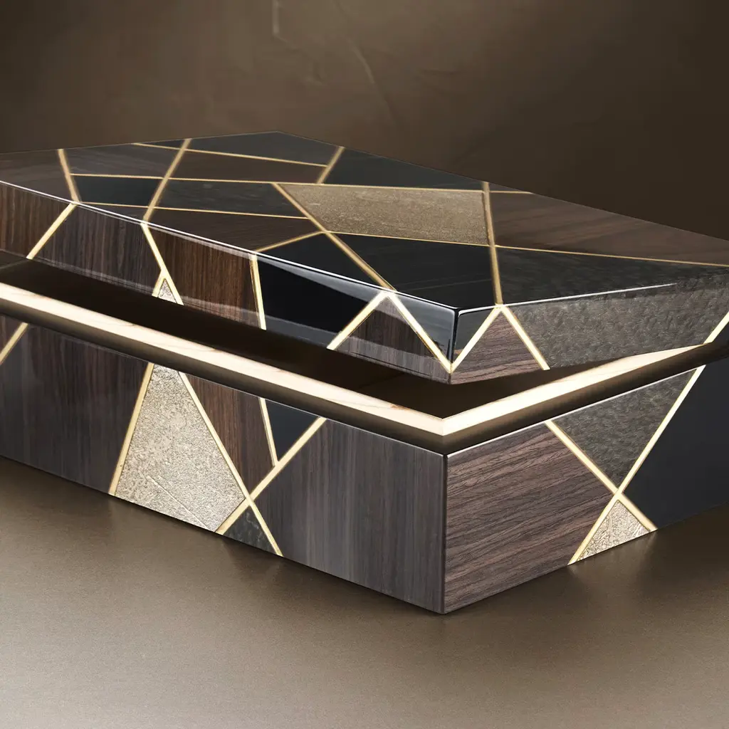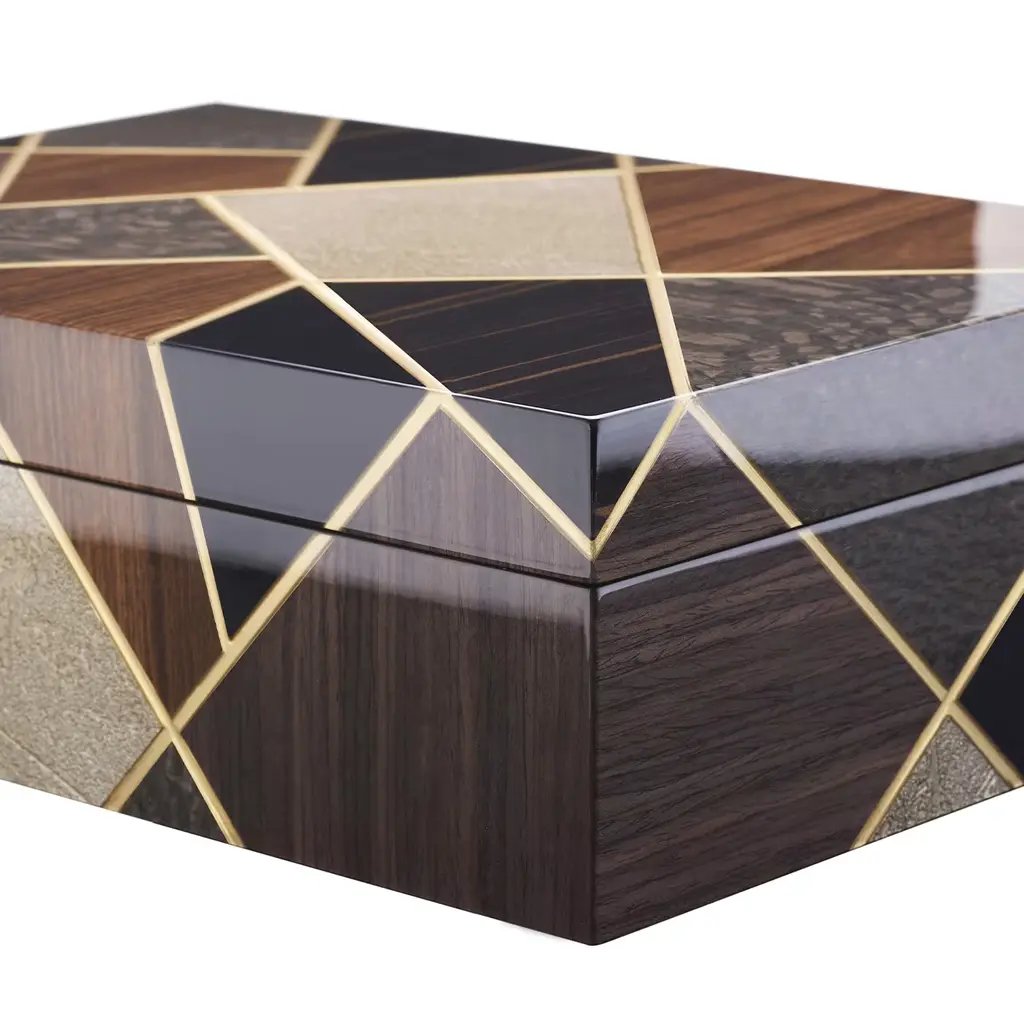 This precious jewelry box is a true gem for collectors. Showcasing a handmade geometric inlay employing prized briar, ebony, bolivar, ash, and rosewood veneers, hand-poured gold details trace the borders betwen the different wood essences accented by brushing and polishing steps. Upholstered in Alcantara, the interior is equipped with two watch holders, ring holders, and a removable tray.