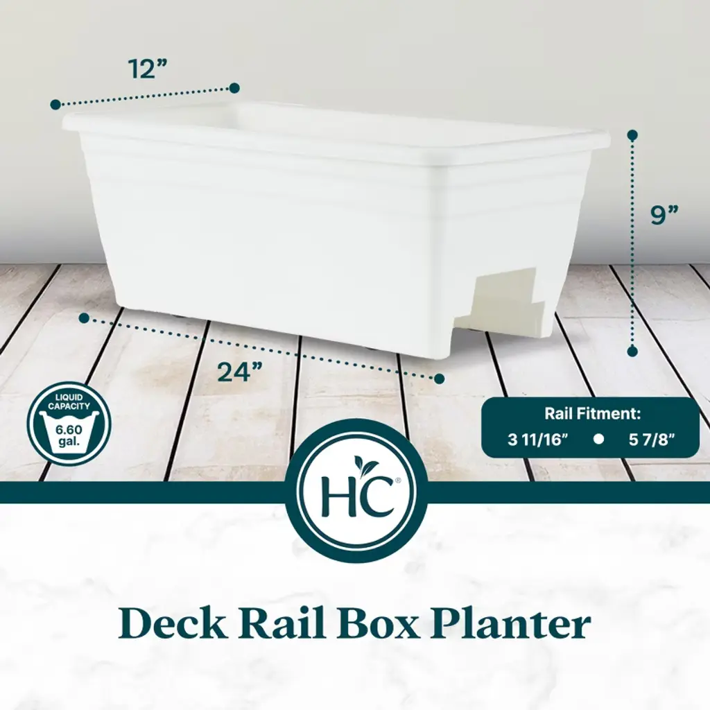 Fall in love with your flowers every time you look out your deck with The HC Companies Heavy-Duty 24-Inch Deck Rail Box Planter with Drainage Holes. This outdoor railing planer is ideal for any deck, patio, balcony, porch, garden, or fence railing. This big planter box for railing use features a thick durable-wall plastic construction, so you can rest assured it will hold up against the elements. The stylish design and color market his flower box perfect for any space. Enjoy planting live flowers or displaying decorative plants in this 24-inch rectangular planter box. With removable dual drain plugs, this railing basket offers maximum drainage and makes it easy to transfer outdoor plants to inside places. Enhance your indoor or outdoor setting and enjoy watching your garden thrive. Fits most 2-by-4-foot or 2-by-6-foot wide deck rails. Give your outdoor deck the attention it deserves with the Heavy-Duty 24-Inch Rail Box Planter with Drainage Holes from The HC Companies.