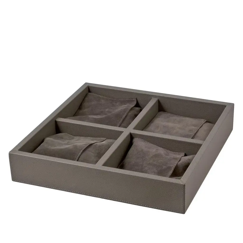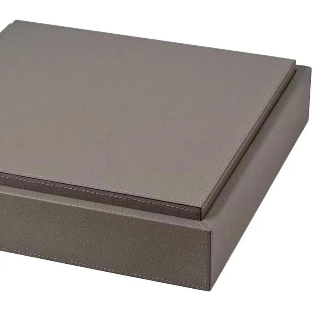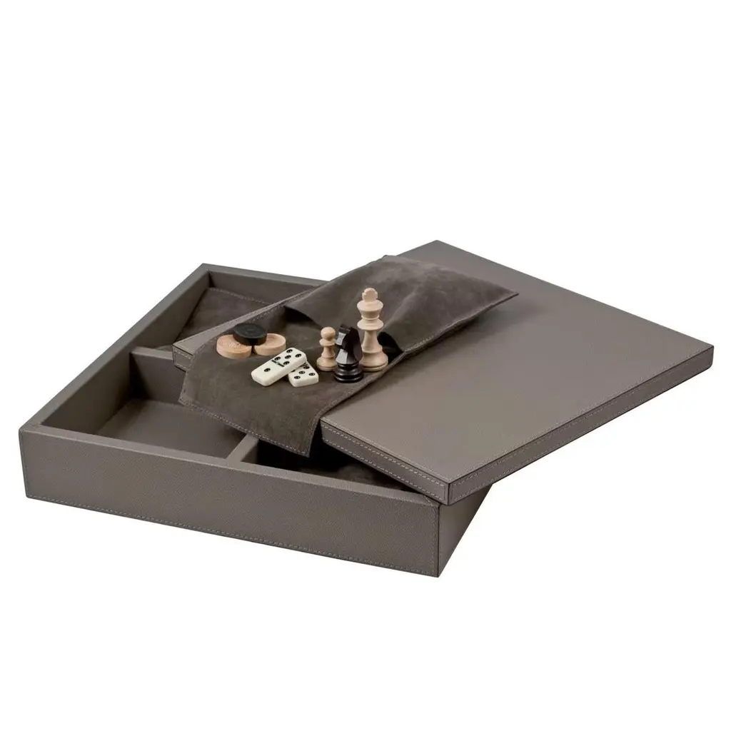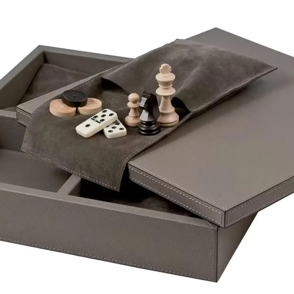 Game box threefold with solid wood structure covered withhigh quality italian genuine leather., including 3 sets of games:draughts, domino and chess. Sets inside includes boxwood draughts pieces, bakelite dominos and boxwood chess pieces.The playing field surface is made of inlaid leather pieces. Also available with other leather colors, on request.