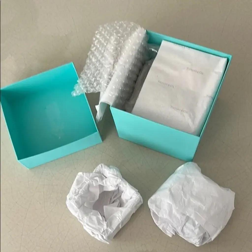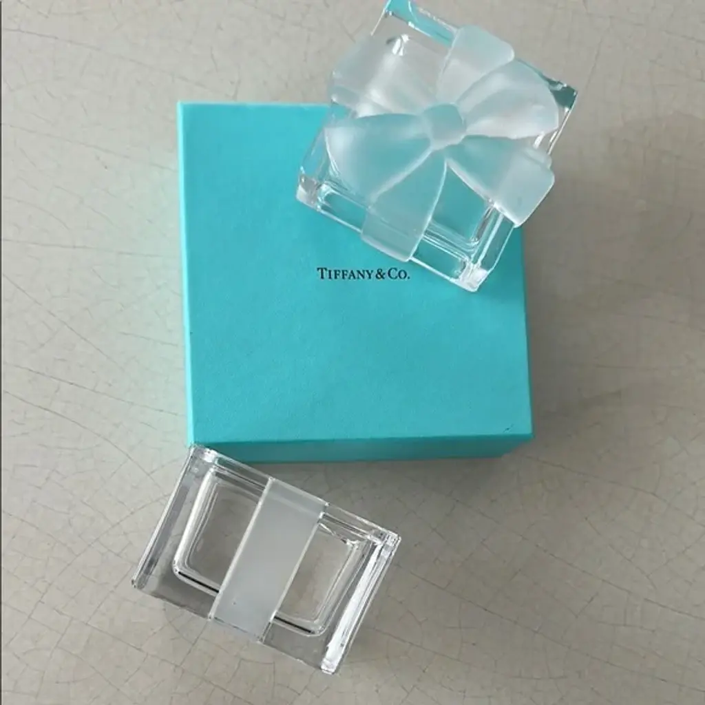 Discontinued Tiffany glass bow trinket box Clear glass box with frosted glass bow The box is often referred to as an "iconic Tiffany" trinket box. Packaged in in original tiffany tissue paper, bubble and iconic tiffany Blue gift box and blue tiffany sticker on lid of box. This item is in pristine never been used condition cover photo/unwrapped full item photo is my personal box to show what item looks like when and NOT for sale Tissue paper in one box has a tear. Please see photo for condition two boxes are available each sold separately.