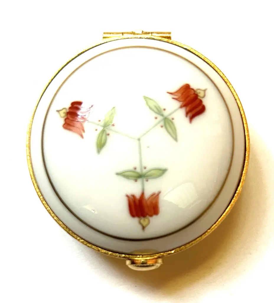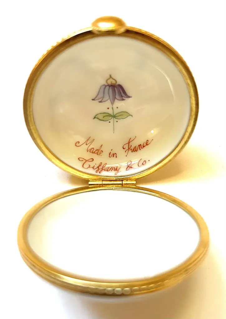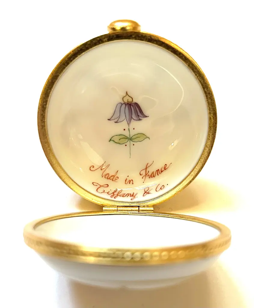 Exquisite hand-painted French porcelain box with ormolu latch and fittings. Made by the singular atelier of Camille Le Tallec. Beautifully rendered colorful red and purple posies bloom against a pristine white porcelain background enhanced with gilt gold and bordered by rich lemon yellow. The bottom of the box sports more red posies. Marked "Tiffany & Co. Made in France.”