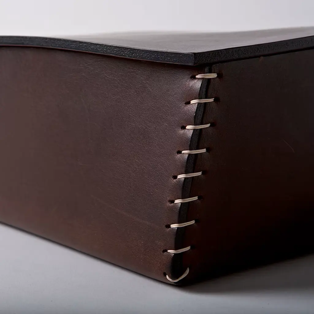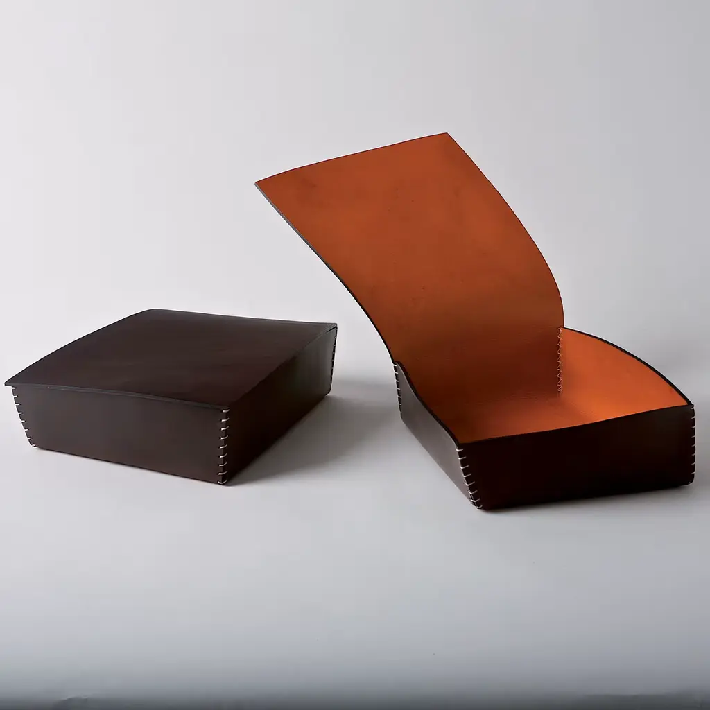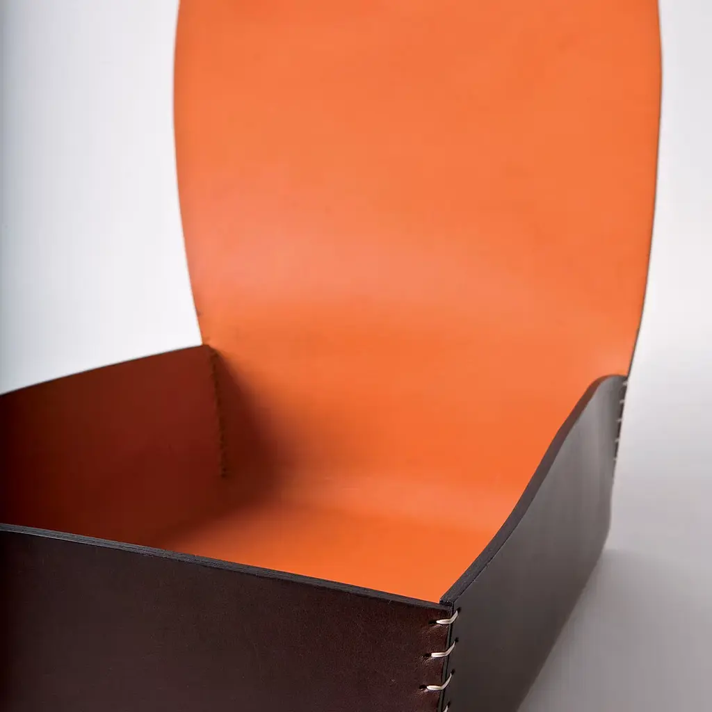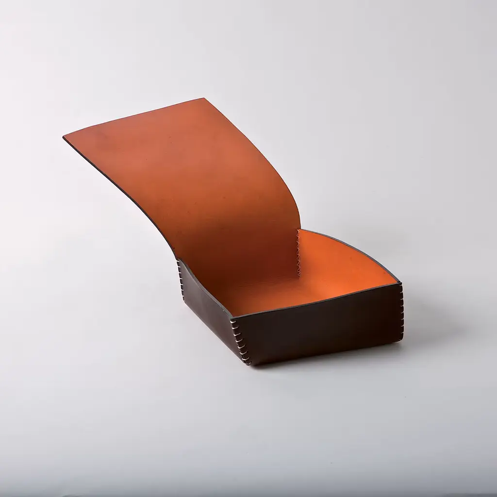 Opulence and simplicity effortlessly coexist in this sophisticated box designer Claude Bouchard molded from a single sheet of premium leather. Made fresh by its subtly irregular design enriched with manual contrasting stitching, the box results from patient cutting and folding steps carried out by hand that speak to its precious artisan quality. Color contrasts between the interior and exterior are possible thanks to a wide variety of color customizations.