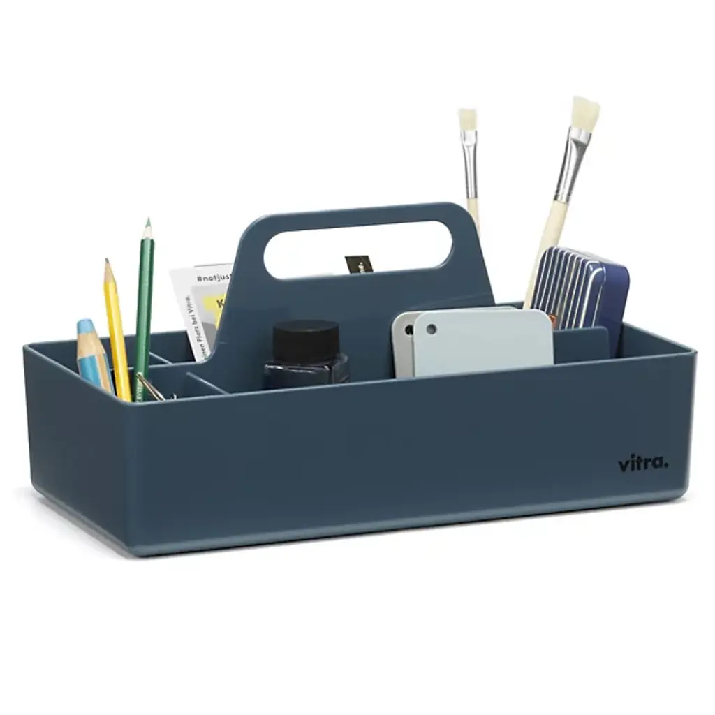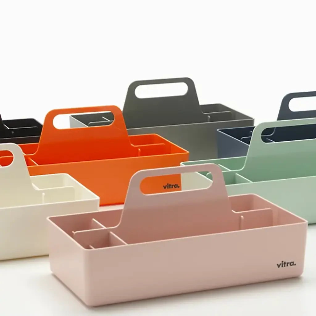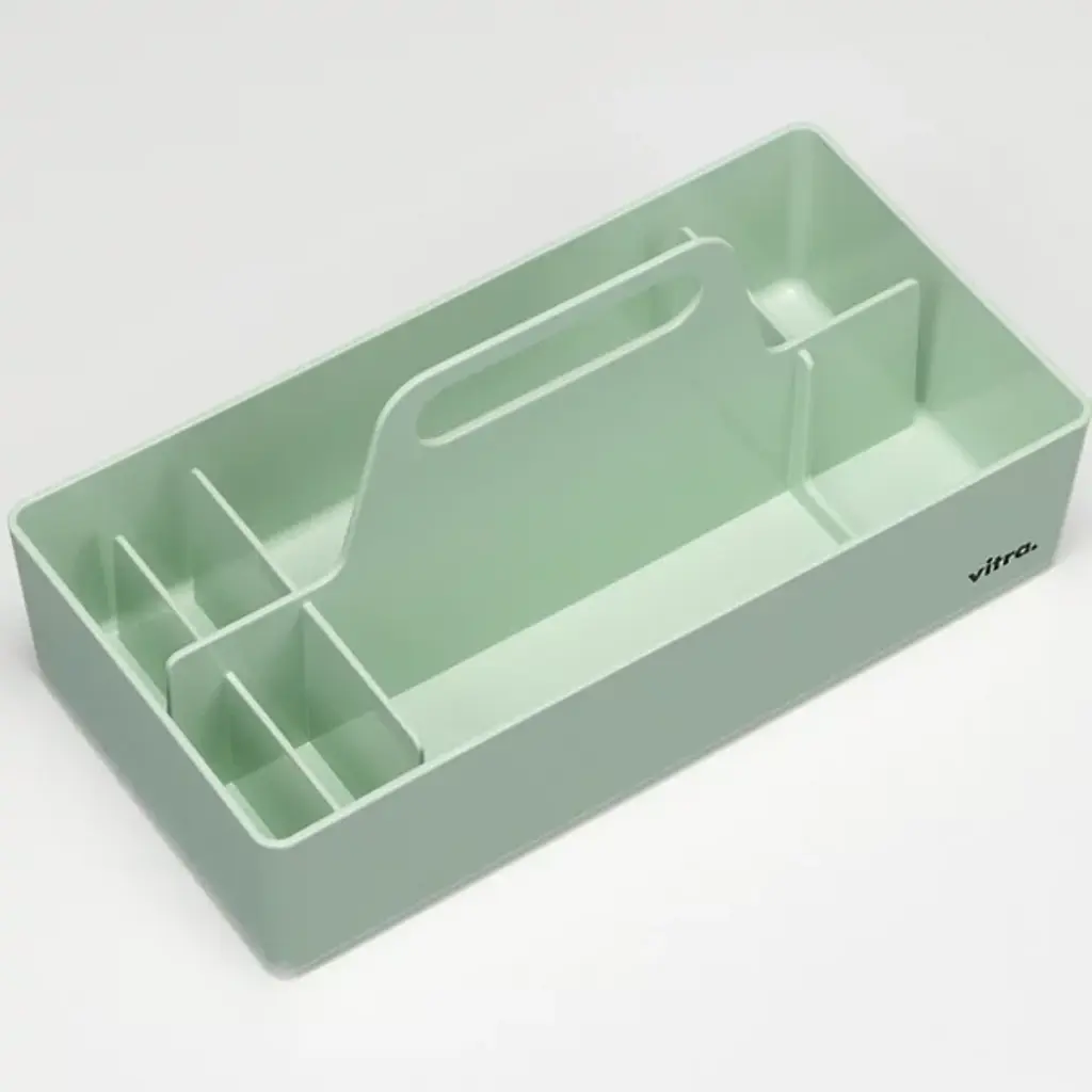 The Toolbox RE from Vitra gives one a hand on demanding tasks or helps one store for a tidier space with a clean contemporary design. Creator Arik Levy's work is an exploration of symbols. Levy finds the essence of each design, arriving in pieces that are easy to understand. The toolbox reflects this sentiment with a geometric composition. Slender dividers give items big or small their place for easy plucking. The strong abs plastic piece produces an elegant handle for enhanced mobility.