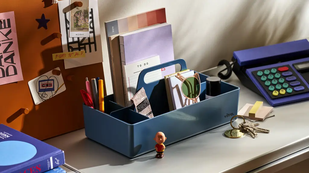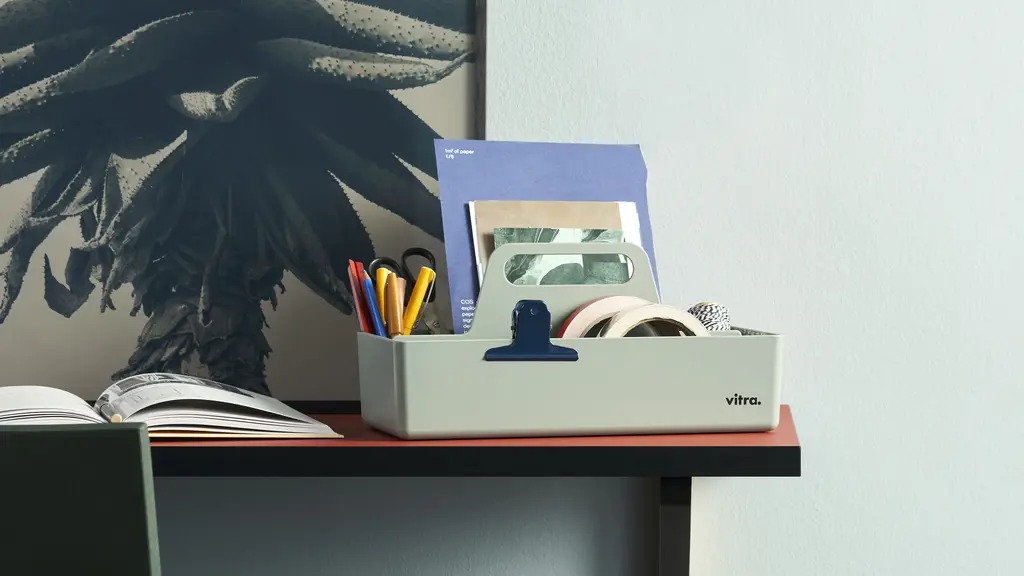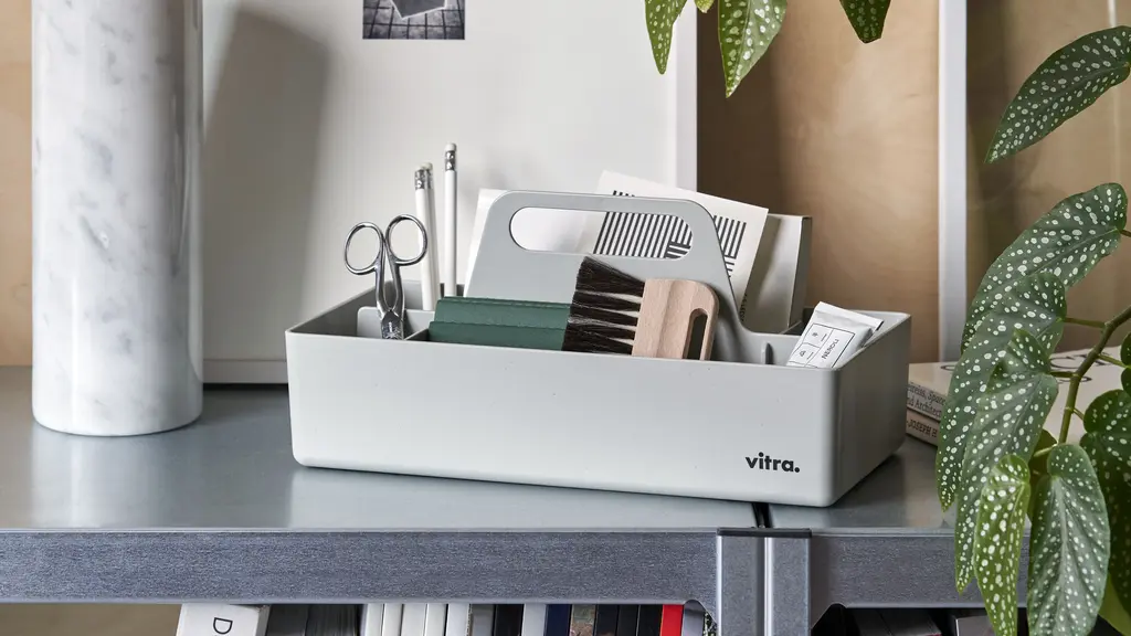 Toolbox RE is a practical organiser for storing and transporting small work utensils and accessories. Made of recycled plastic from industrial waste, the portable caddy is itself 100% recyclable at the end of the product's lifespan. Toolbox RE comes in a selection of colours.
