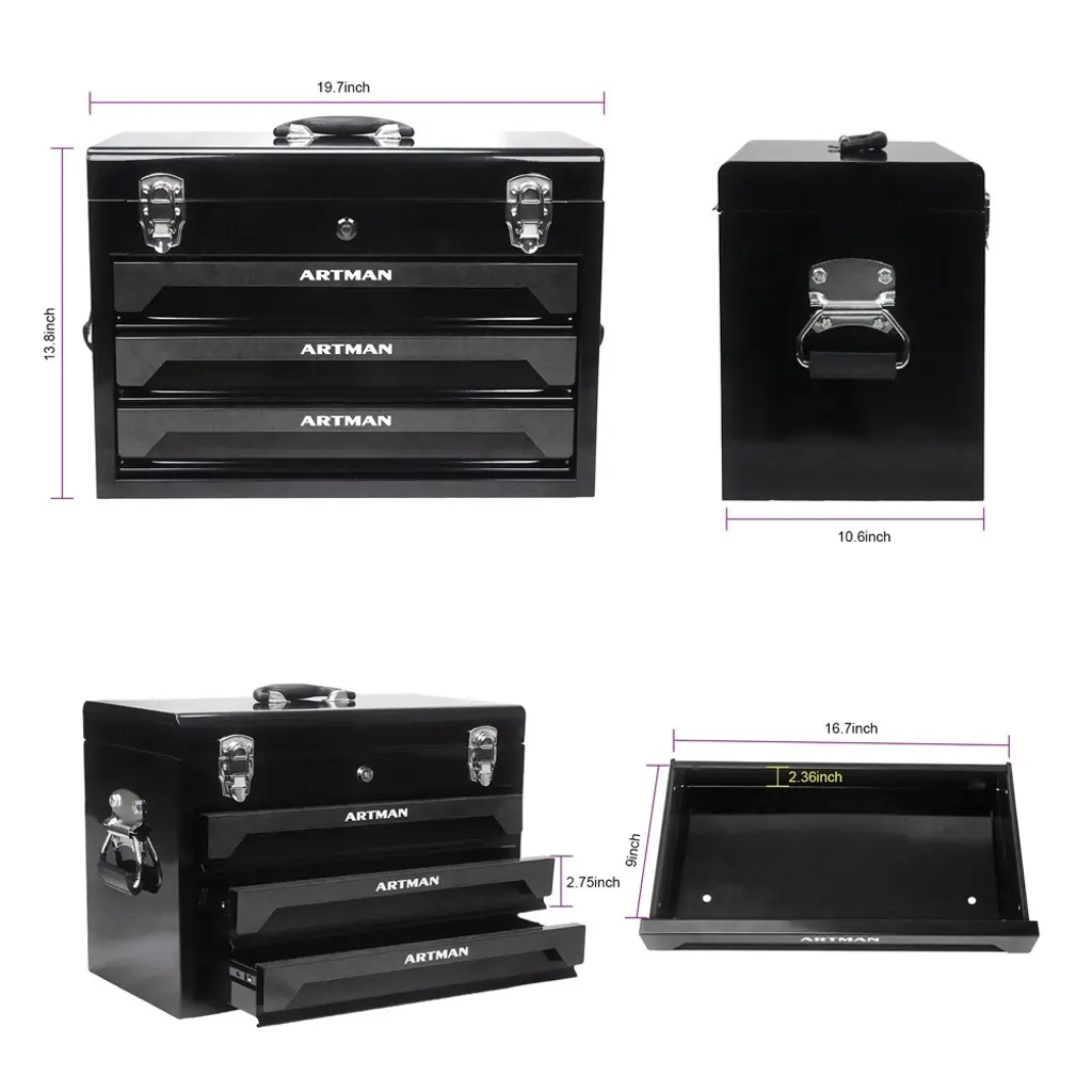 Toolboxes, 3 Drawers Metal Toolbox, Safe Lockable Tool Storage Cabinet - Black