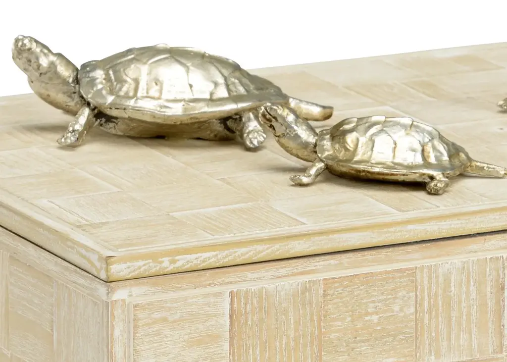 Conceal personal items around your home with the Tortoise Family Box. Featuring a family of charming silver plated turtles crafted of composite on a whitewashed wooden box, this box is ideal for any waterfront home.