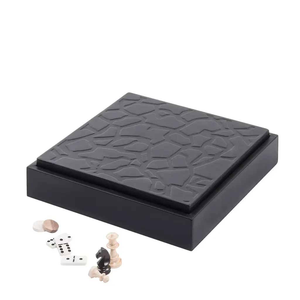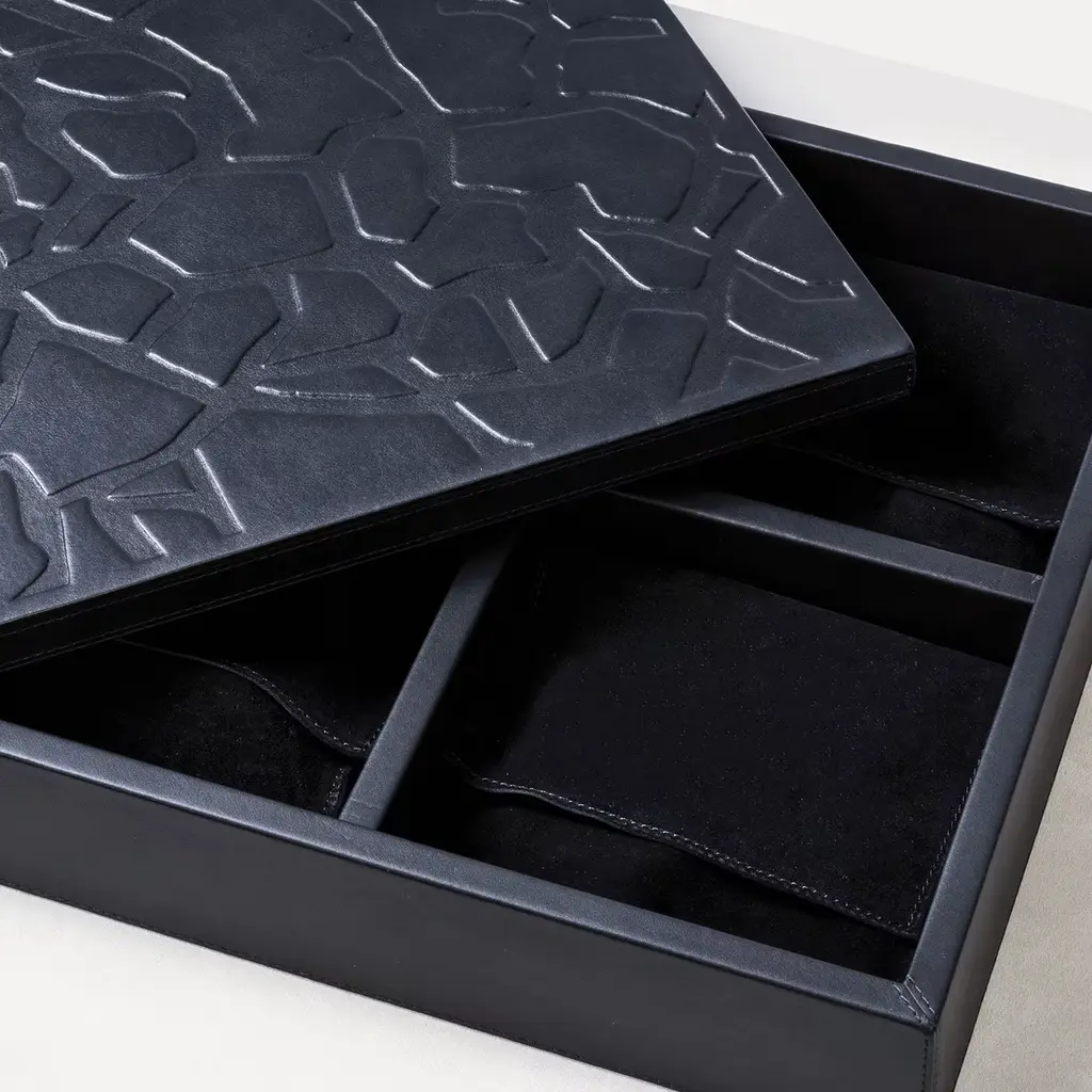 This elegant game box is part of the limited-edition Tosca Collection and features a black nappa-clad wooden box divided into four compartments designed to store the boxwood chess and checker pieces and the Bakelite domino pieces. The top bears an embossed geometric design on top and a chessboard on the reverse. Customization available upon request, please ask the Concierge for details.