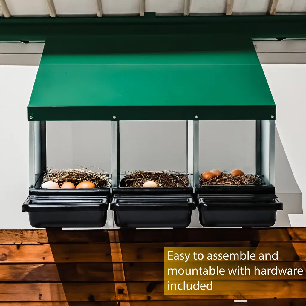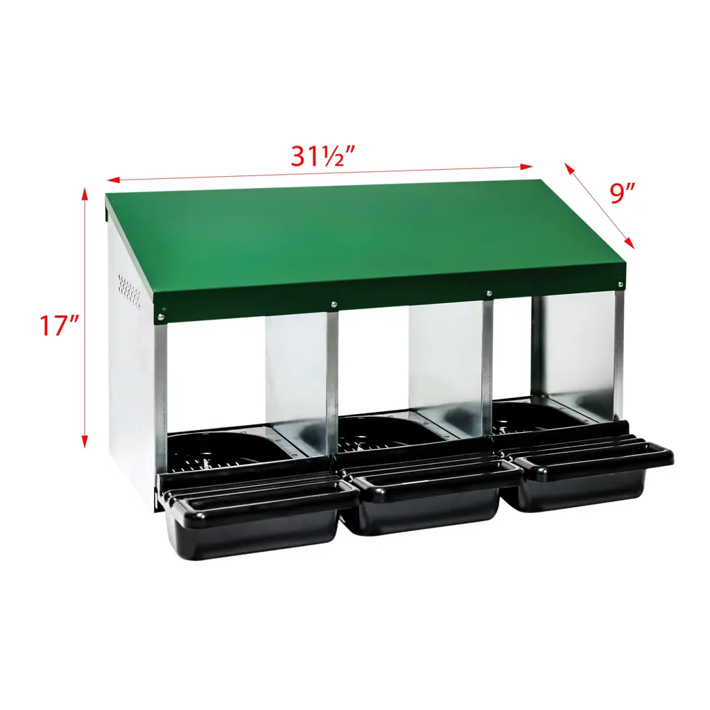 This nesting box for laying eggs is the perfect addition to your chicken coop. There are 3 compartments for chicken to safely and securely roost and lay their eggs. The nesting unit measures 31.5"L x 9"W x 17'H at its highest point and each compartment is 9.6"L x 8.8"W. Made from galvanized steel, the nesting box is built to last with ventilation holes on the sides to keep the unit cool and comfortable. The trays are made from plastic which won't rot or rust and the egg trays have holes in the bottom so debris can travel through making them easy to keep clean. Step by step assembly instructions are included along with all the hardware needed to put together the box. Once hung, the nesting box has a slight forward slant to the eggs easily roll into the covered trays until ready to be collected. Keep your chickens and their eggs happy and safe with this nesting box. Ages 14+. By Trademark Innovations.