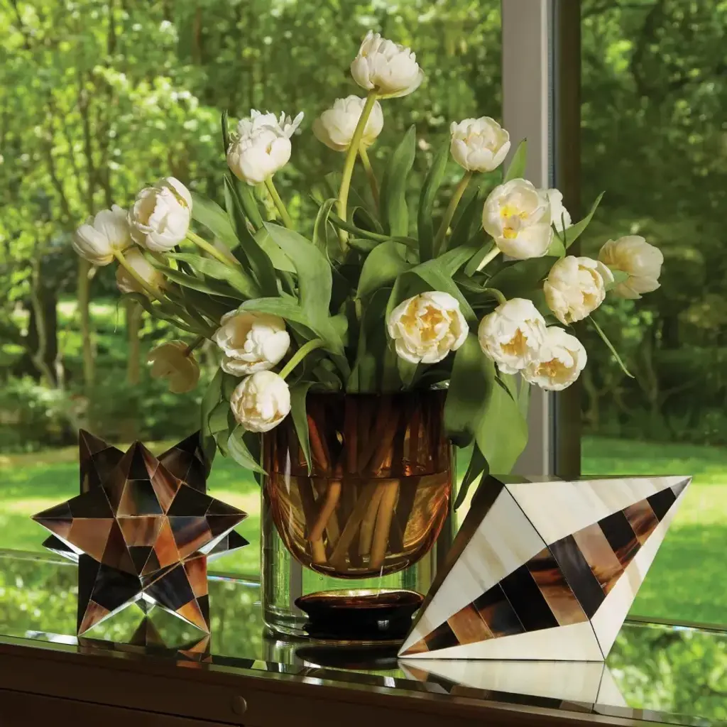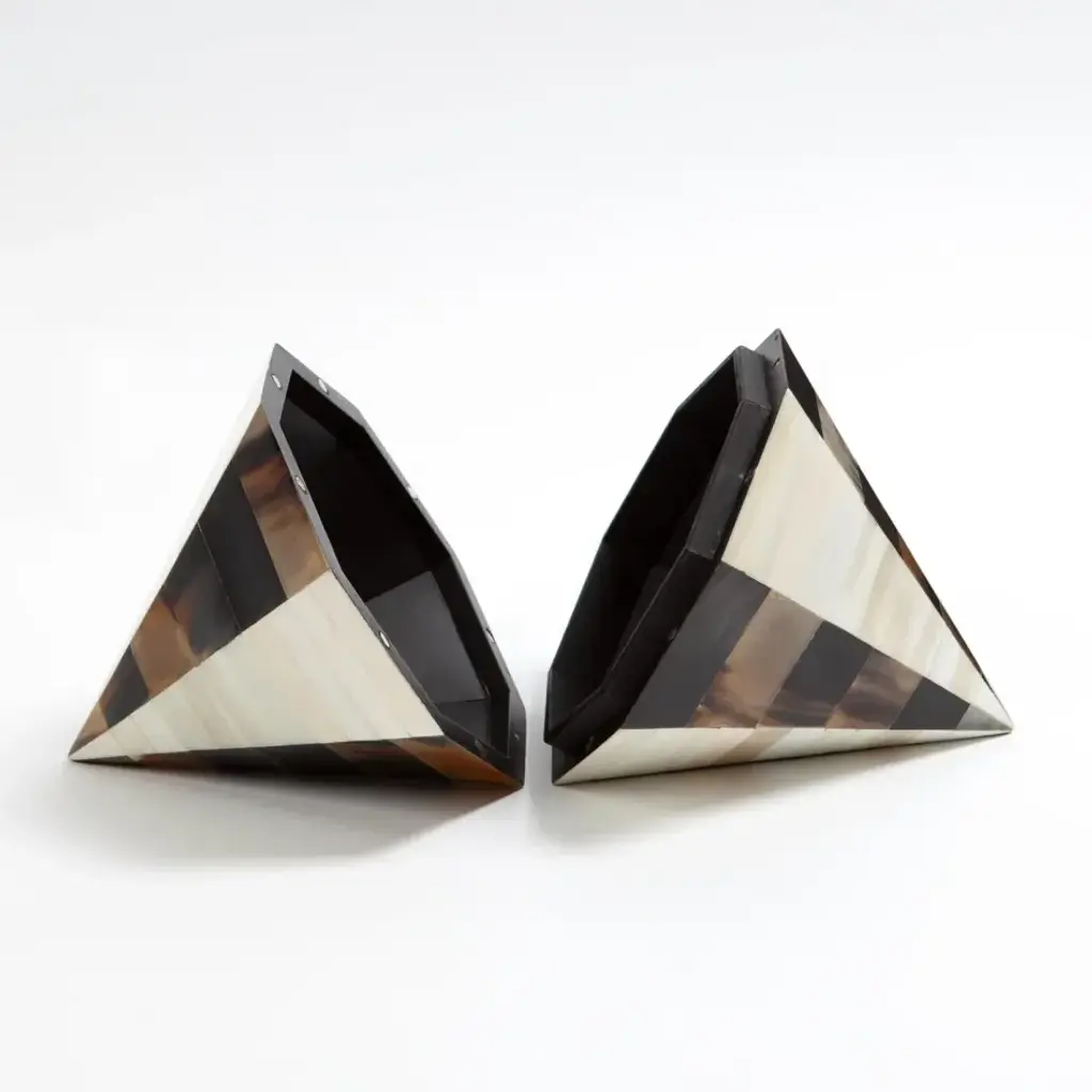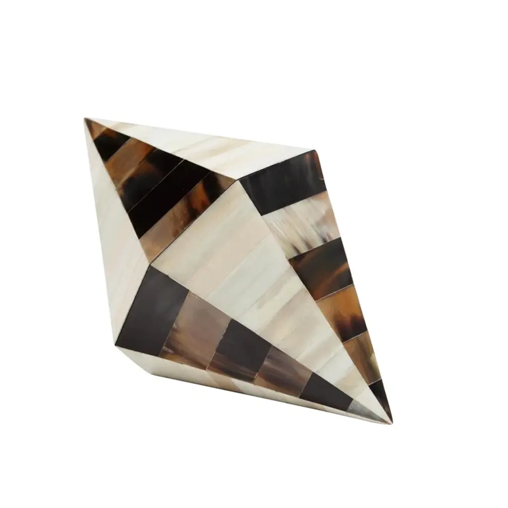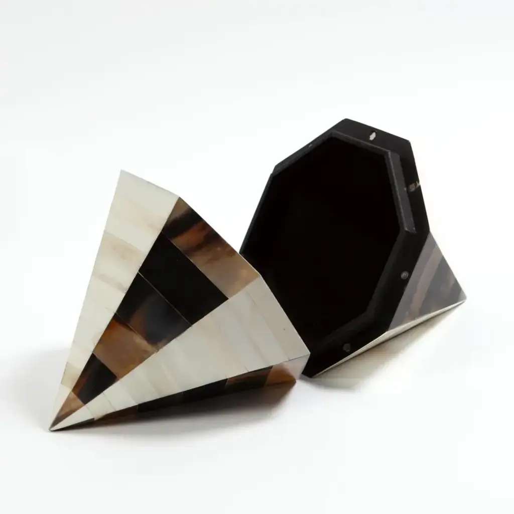 This stunning geometric box is just as functional as it is beautiful. Featuring an MDF substrate and bone and horn veneers, our Triangle Cone Box has multiple small magnets on both the top and bottom to keep them united when the box is closed. From a fashion forward perspective, Global Views offers accessories, furniture, statement lighting, and an assortment of rugs and mirrors to add beauty and joy to your home.
