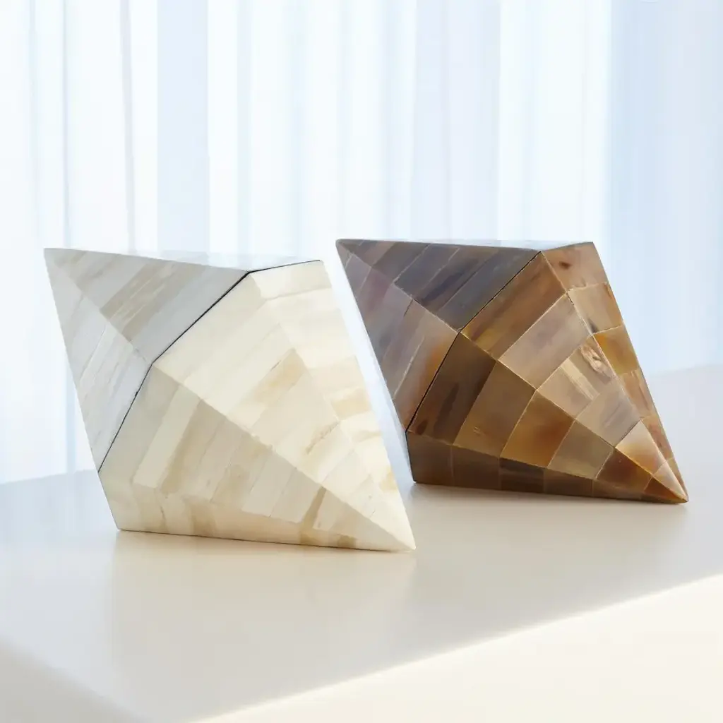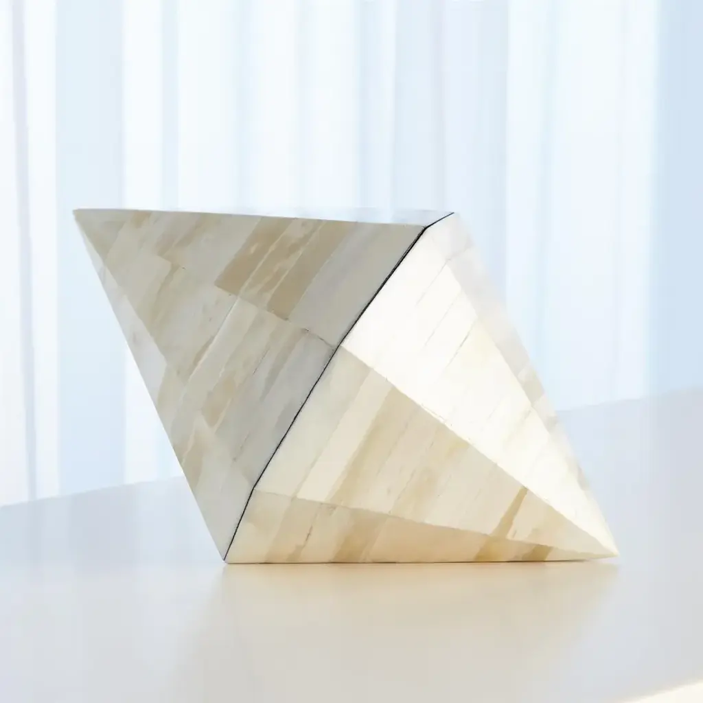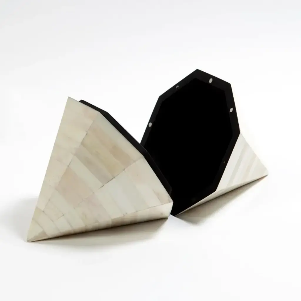 This stunning geometric box is just as functional as it is beautiful. Featuring an MDF substrate and bone veneer, our Triangle Cone Box has multiple small magnets on both the top and bottom to keep them united when the box is closed. From a fashion forward perspective, Global Views offers accessories, furniture, statement lighting, and an assortment of rugs and mirrors to add beauty and joy to your home.