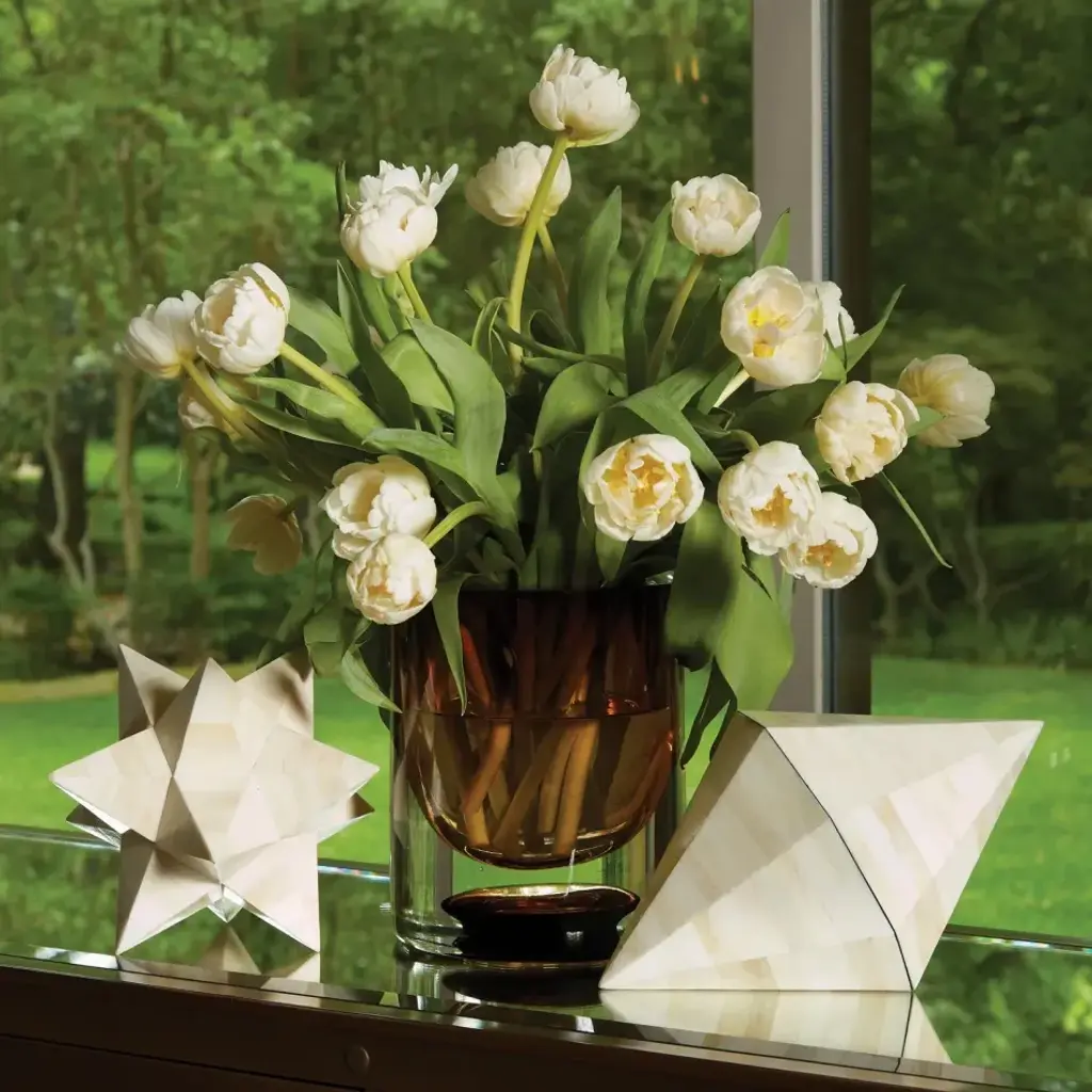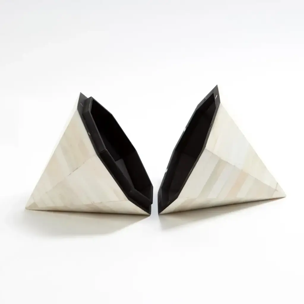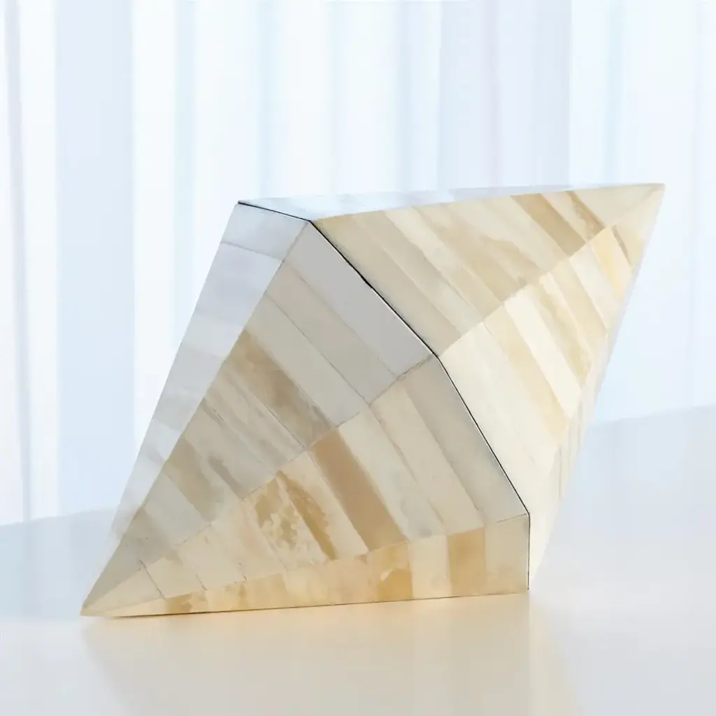 This stunning geometric box is just as functional as it is beautiful. Featuring an MDF substrate and bone veneer, our Triangle Cone Box has multiple small magnets on both the top and bottom to keep them united when the box is closed. From a fashion forward perspective, Global Views offers accessories, furniture, statement lighting, and an assortment of rugs and mirrors to add beauty and joy to your home.