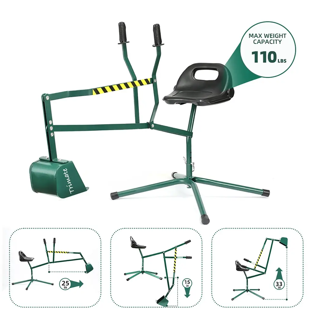 TRIMATE SANDBOX EXCAVATOR: HUNTER GREEN - Enjoy endless all-season adventures with the Trimate Sandbox Excavator! Whether sifting sand, moving dirt, or shoveling snow, this sturdy metal construction toy can handle it all. Designed for both fun and learning, the two-handed controls offer kids an exciting, hands-on experience. It's not just playtime; it's an opportunity for children to enhance their manual dexterity and hand-eye coordination in a way that feels effortless and enjoyable. Perfect for outdoor play, kids will stay engaged for hours as they build and create in their sandbox or yard. The durable, weather-resistant design ensures long-lasting use in various conditions, making it a great toy for year-round play. Plus, the weight limit of 110 lbs allows children of different ages to join in the fun. This excavator provides an authentic and engaging experience for children who love construction play. Some assembly is required, but once it's ready, the adventures are endless! Get ready for digging, lifting, and creative construction with the Trimate Sandbox Excavator. STURDY & DURABLE METAL CONSTRUCTION: Metal construction ensures long-lasting use in all weather, providing endless digging fun and enhancing physical activity. ALL-SEASON VERSATILITY DESIGNED for year-round play—whether sifting sand, moving dirt, or shoveling snow, it offers endless opportunities for imaginative outdoor adventures. KID-FRIENDLY DESIGN: Clever design features a large, comfortable seat for kids to ride on and can handle weight up to 110 lbs, while providing your child with years of active hands on play. DOUBLE OPERATION HANDLES: Left handle controls the height of the digger's arm, and the right handle controls the bucket's direction and the amount of sand in bucket. The rubber grips offer comfort during play. WEATHER-RESISTANT DESIGN: Built to withstand outdoor conditions, it's perfect for rain or shine, ensuring reliable performance and continuous enjoyment. INDOOR & OUTDOOR PLAY!