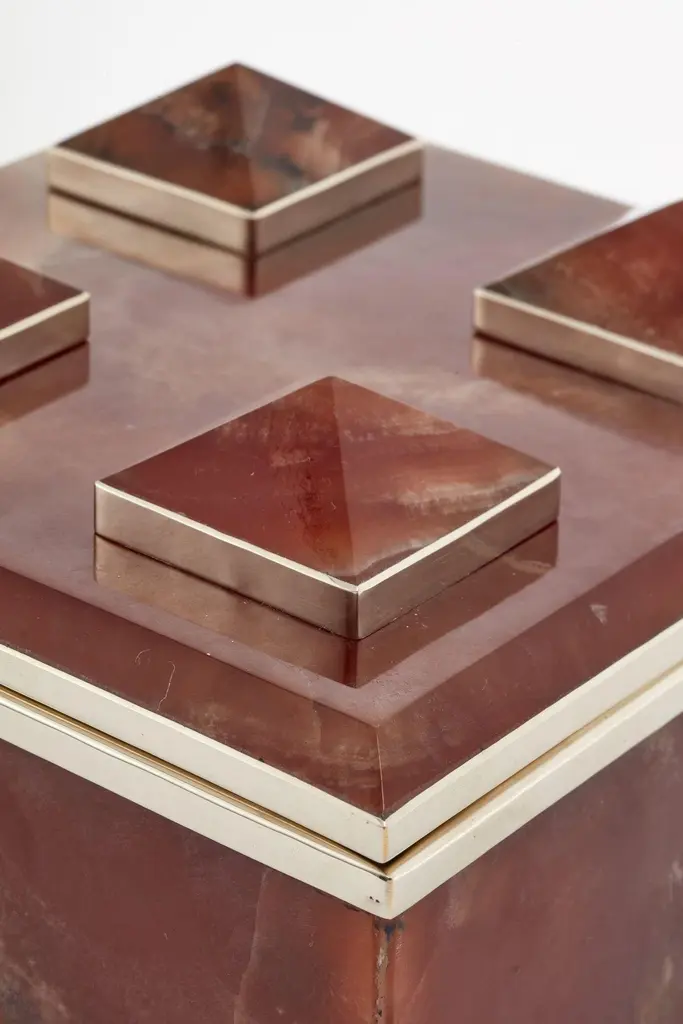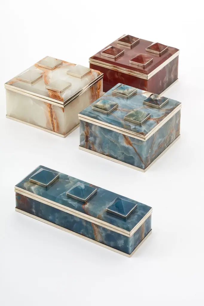 The shape of the inactive Tronador volcano reminded us of the pyramid shaped idea of our boxes that make up this collection. With a rectangular or square base, the box is a reflection of this magnificent inactive mount between Argentina and Chile, a part of the Andes Mountains.Our pieces are made by hand. One of a kind.All natural stones may vary in color.