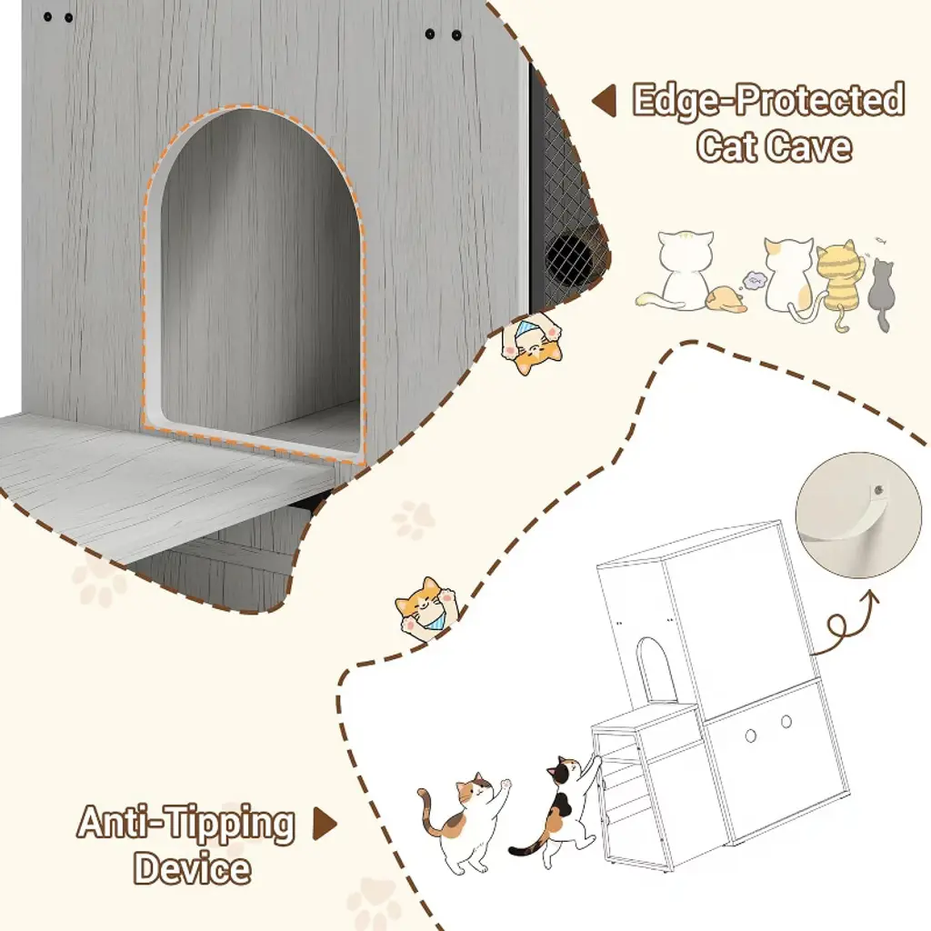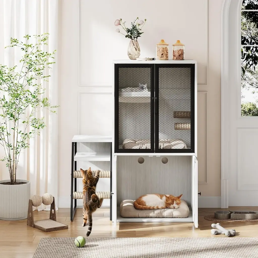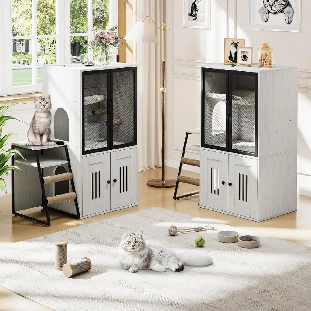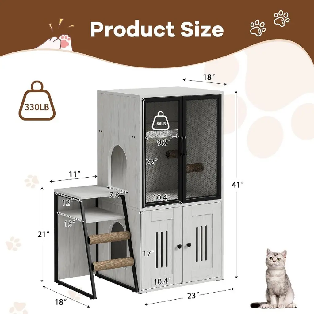 1.Spacious Multi-Cat Design for Versatile Use This double cat enclosure is thoughtfully designed to accommodate two cats, seamlessly combining a litter box area, play zone, resting space, and storage¡ªall in one. Its arched safety edges prevent accidental bumps, while adjustable feet enhance stability on uneven floors. The soft wool felt base protects your flooring from scratches, making it suitable for any room. This all-in-one solution keeps your home tidy by centralizing your cats¡¯ needs, from toileting to play, in a single, organized space. 2.Movable Sisal Ladder for Climbing & ScratchingEquipped with a movable sisal ladder, this enclosure helps cats jump confidently between levels, satisfying their natural urge to climb. The sisal-wrapped steps also serve as a scratching surface, keeping their claws healthy and reducing damage to your furniture. A built-in storage platform on the ladder provides easy access to litter scoops, liners, or your cats¡¯ favorite toys, ensuring essentials are always within reach while saving space. 3.Cozy Hammock & Durable Mesh DoorYour cats will love the included cozy hammock, a perfect spot for napping or lounging after play. Sturdy sisal poles nearby encourage healthy stretching and clawing, promoting exercise and reducing stress. The metal mesh door not only allows for easy interaction with your pets but also enhances airflow, keeping the enclosure fresh. Made from high-quality, rust-resistant materials, the door ensures long-lasting durability, even with daily use. 4.Effective Odor Control with Strategic VentilationFront and rear vents are strategically placed to boost air circulation, helping to reduce litter odors and maintain a fresher interior between cleanings¡ªideal for multi-cat households where odors can build up quickly. This ventilation system works alongside the enclosed design to contain mess while keeping the air inside pleasant, ensuring both you and your cats enjoy a more comfortable environment. 5.Easy Assembly & Space-Saving SizeSetting up the enclosure is hassle-free with detailed instructions and all necessary hardware included, allowing you to assemble it quickly without professional help. The cabinet measures 22.6" L x 17.7" W x 10.9" H, with the ladder at 11" L x 17.7" W x 21.4" H, making it compact enough to fit in most rooms. Its stylish design blends seamlessly with various home decors, adding functionality without compromising on aesthetics.