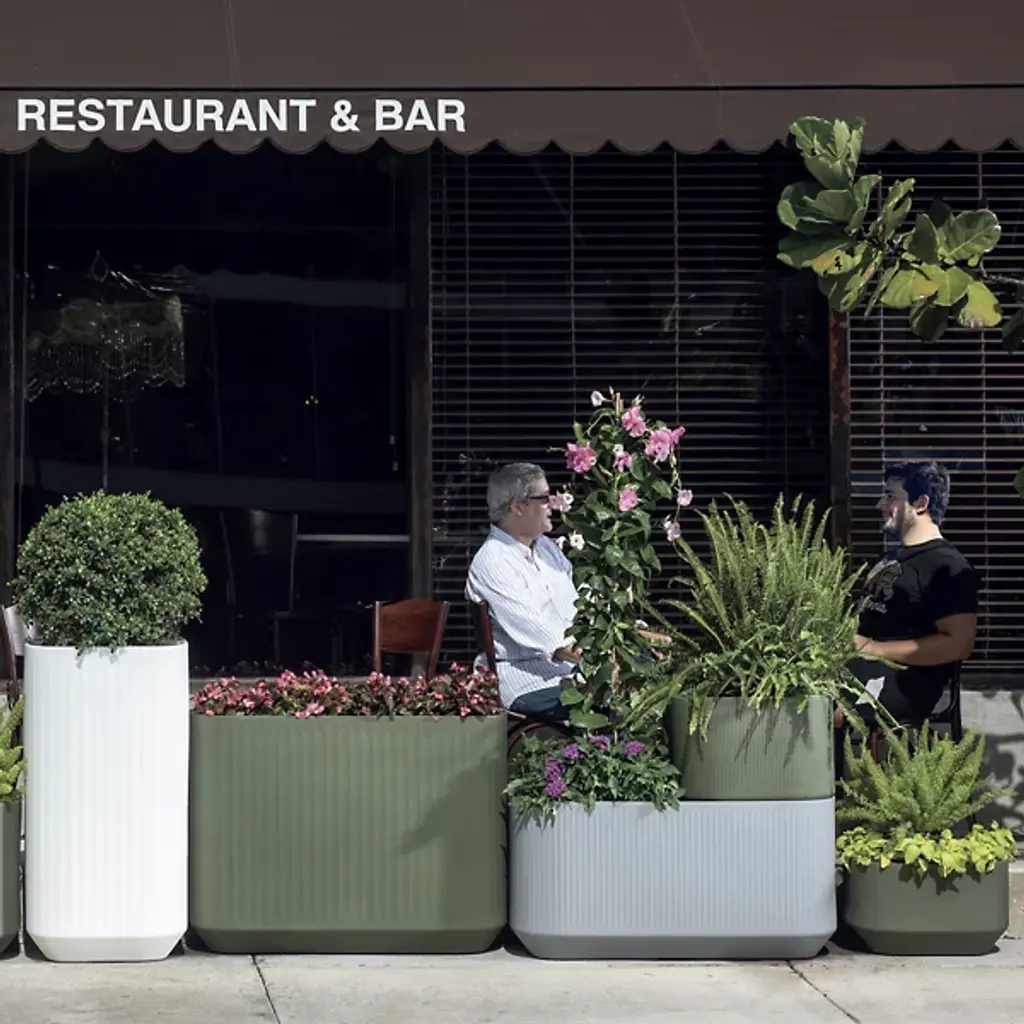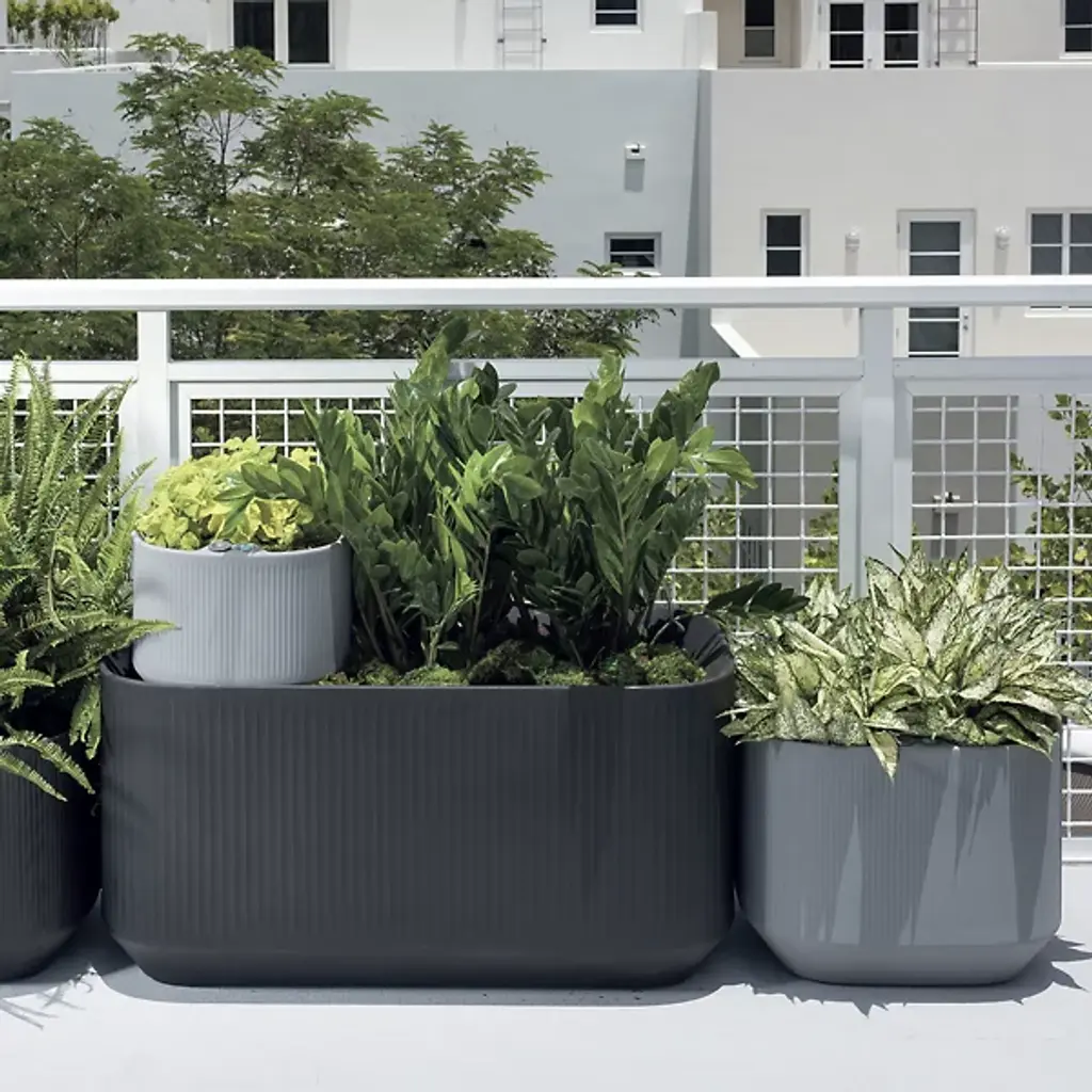 The TruDrop Self Watering Small Modular Planter Box by Crescent Garden protects and displays arrangements within a double walled construction. A vertical texture travels around this tall container, with rounded edges and a smooth base. Resistant to cracking or fading, this weather friendly planter features a Tru Drop system, streamlining the container gardening experience by providing a reservoir for watering and fertilizer to keep plants healthy and happy. With drainage options for both indoor and outdoor use, this piece was designed with modularity in mind and can be stacked and combined with other Mod Planters for a unique arrangement.