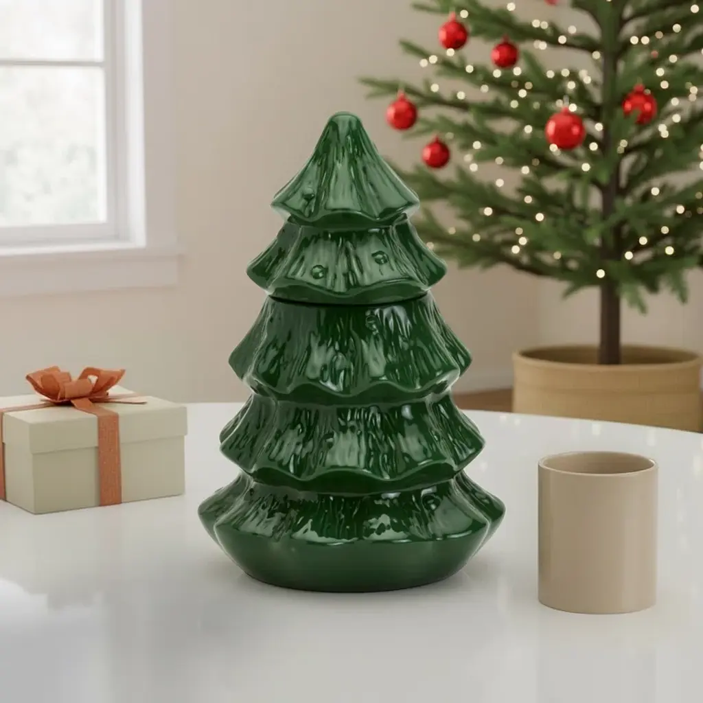 Decorate your kitchen for the holidays with this charming green Christmas tree cookie jar! This ceramic tree features a lovely, textured design and beautiful dark green color that adds style to your other holiday décor. The top easily comes off for quick access and includes a gasket to keep your cookies fresh and secure.