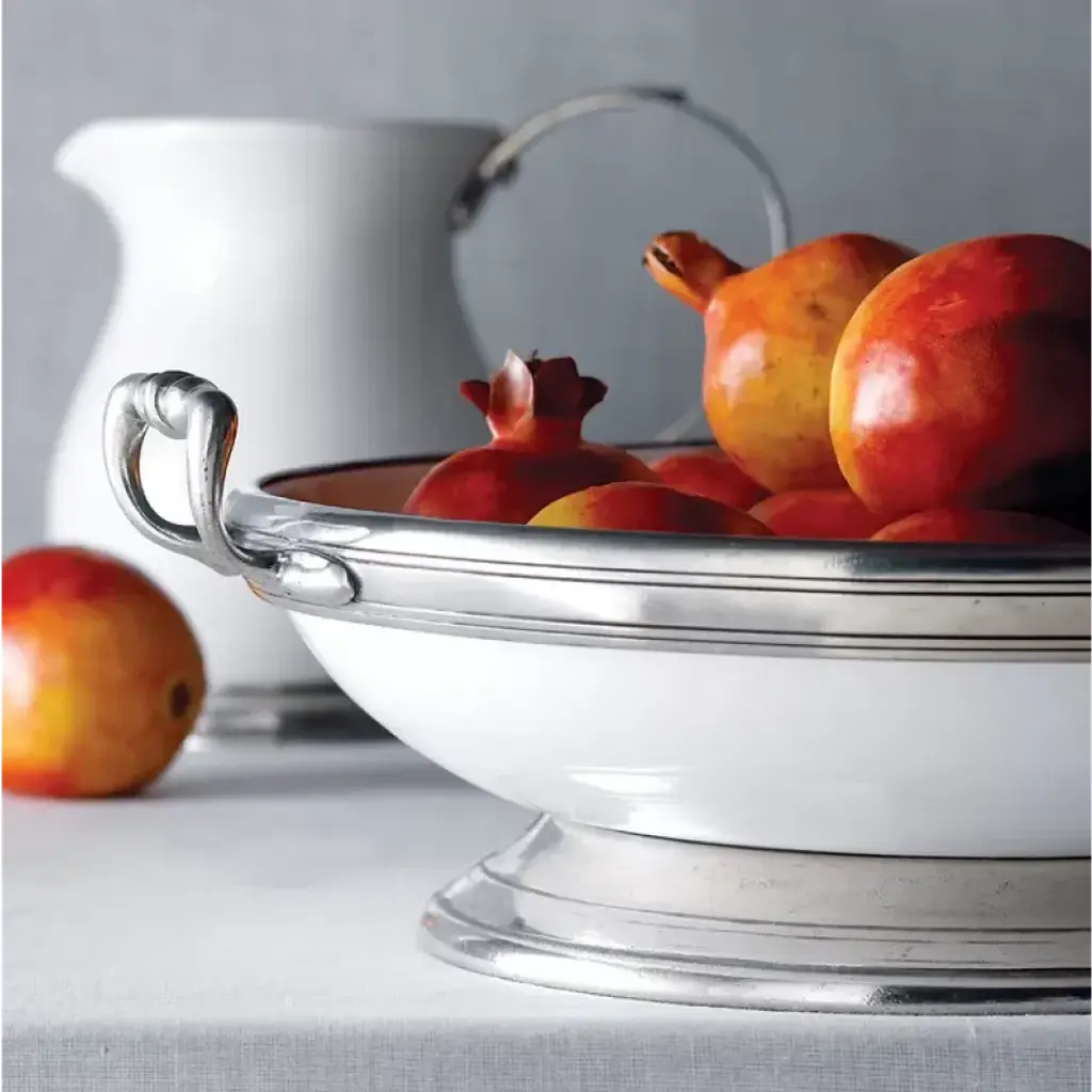 Arte Italica’s best-selling Tuscan Collection, the first pewter and ceramic dinnerware introduced to the marketplace, combines white ceramic with our signature pewter trim. Handcrafted in Italy of the highest quality materials, this classic collection translates seamlessly from traditional to contemporary, from casual to formal. Handmade in Italy. Five-piece setting (charger) includes: charger, dinner plate, salad/dessert plate, pasta/soup bowl, mug. Five-piece setting (cereal) includes: dinner plate, salad/dessert plate, pasta/soup bowl, cereal bowl, and mug. Founded in 1997 by Ann Skidmore, Arte Italica is a story of one woman's passion for Italian history, culture, art, and vintage pewter. Today, Arte Italica is one of the leading importers of European tabletop and home accessories products in the United States. Every piece is handmade and designed so that they can easily be mixed and matched to create a timeless, classic, and effortless look.