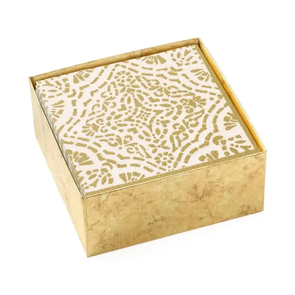 Caspari triple-ply napkins are both striking in design and durable in function. Thoughtfully designed to elevate any occasion, they feature artwork and designs from museums and artists around the world. Each is made of triple-ply tissue and printed in Germany with nontoxic, water-soluble dyes and food-safe ink. They are FSC-certified and made using environmentally-conscious raw materials, which ensures they are both biodegradable and compostable. Our napkins bring eco-friendly style and convenience to your tabletop. 40 napkins included in a gilded gift box with acetate lid. Caspari boxed cocktail napkins make an excellent and useful gift item.