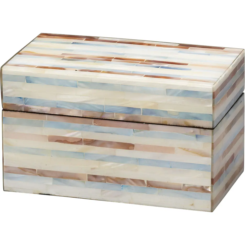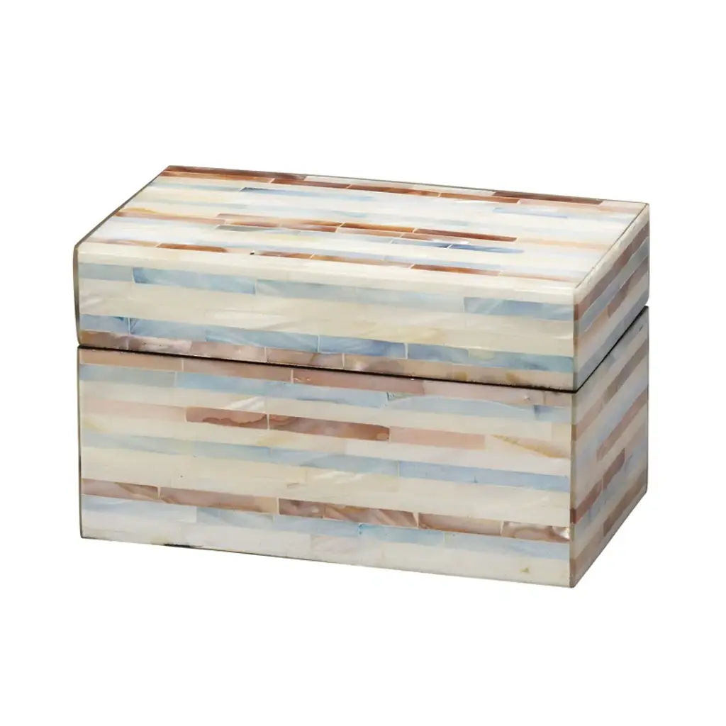 The Uma Mother of Pearl Box Set includes two decorative boxes that have been painstakingly covered in a random pattern of mother of pearl. Given the different hues this natural material exhibits from piece to piece, a lively textural feel is created when the crisp ivories and pale tans are intermingled. This set of beige decorative boxes is as artisanal as accessories come.