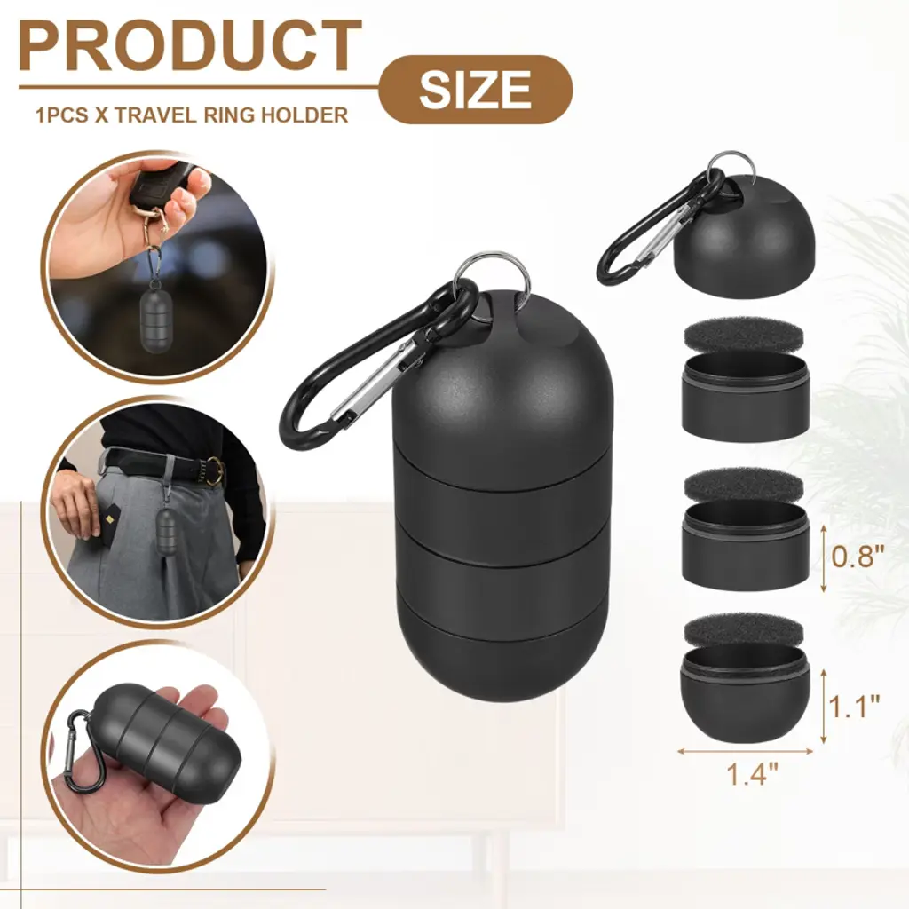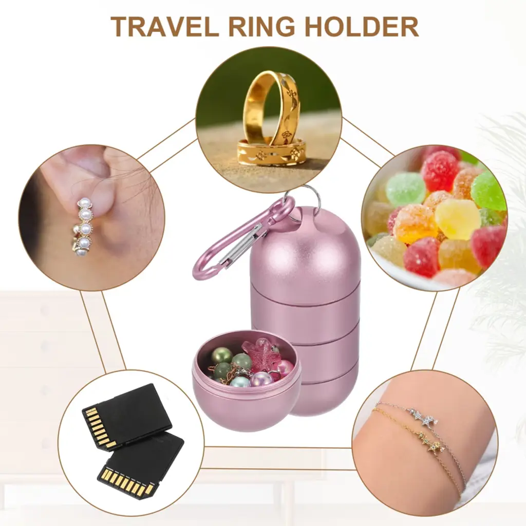 This travel ring holder is made of sturdy aluminum alloy, durable enough to withstand impacts without deformation. A spiral structure with good sealing can protect your precious jewelry even in humid conditions. Jewelry holder keychain is designed with a user-friendly grommet that opens with a simple press. Small ring container adaptable design easily attaches to backpacks, key chains, water bottles, or any other convenient location. The sports jewelry holder includes removable padding that turns it into a versatile container for storing small essentials such as tea bags. Its practical design meets a variety of storage needs. The small ring clip keychain is perfect for storing earbuds, jewelry, earrings, necklaces, and more. It is also good to use it as an earbud holder or jewelry holder keychain case. No need to worry about any loss, very high-end and practical.