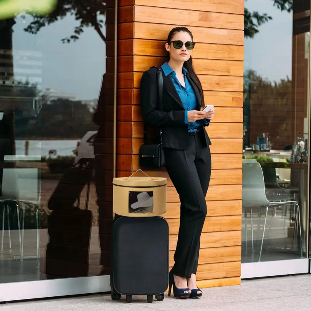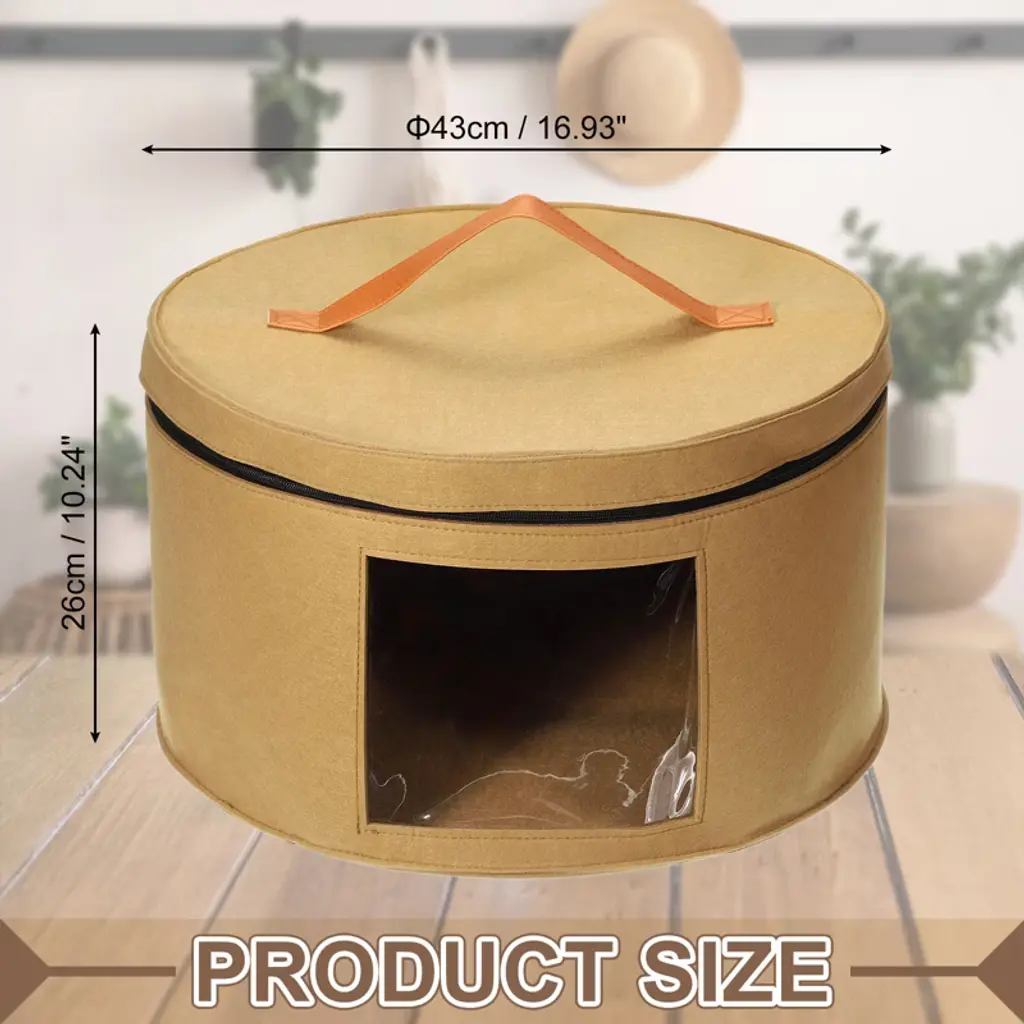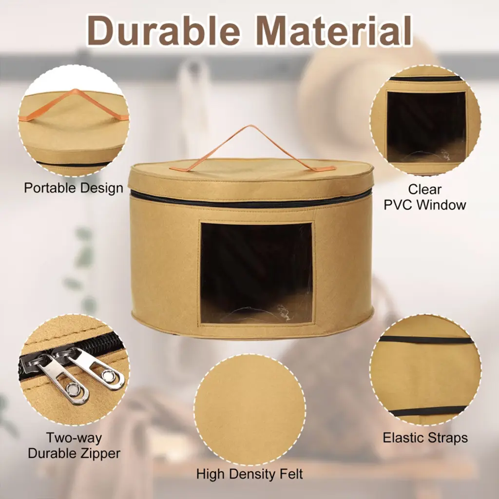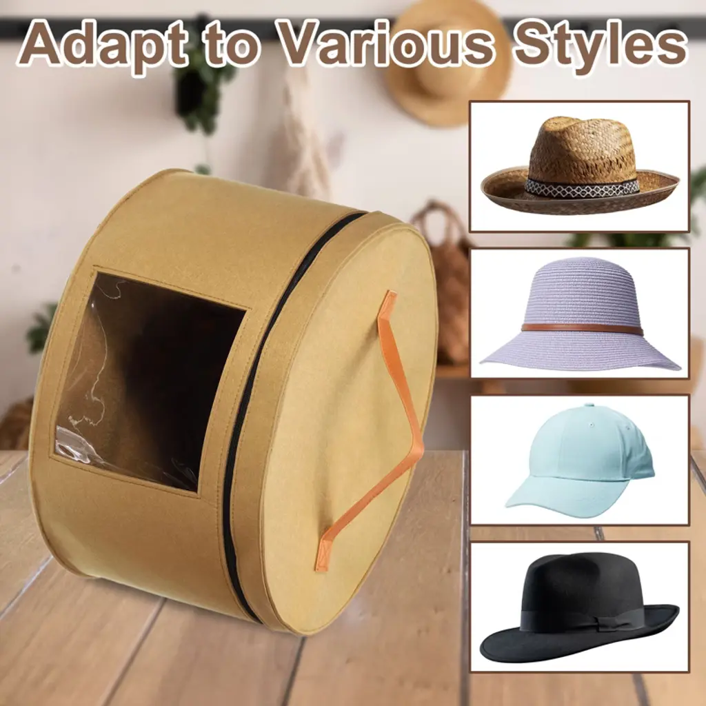 The hat storage box is made of high-density felt fabric, which is wear-resistant and not easy to deform. It features a travel-friendly design suitable for vacation or travel, accommodating cowboy hats, beach hats, sun hats, and baseball caps. The box has leather handles on the sides and top for easy carrying and elastic bands inside to secure the hats. It can hold between 8 and 10 wide-brim hats and has translucent side panels for easy identification. This storage box is versatile and can also store plush toys, clothes, socks, gloves, scarves, towels, or blankets, enhancing the style of your home.