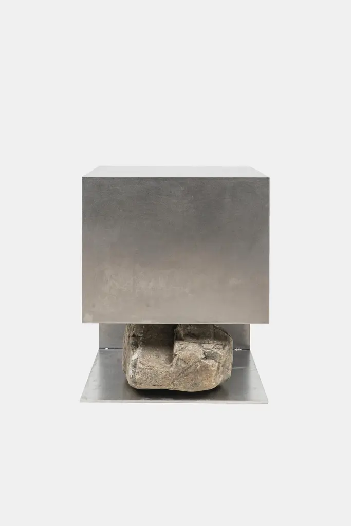 Proportions of stone stool 02 by Lee Sisan, 2019Dimensions: W 36 x D 36 x H 45 cm.Materials: stainless steel, natural stone.Each piece is made to order and uses natural stones, so please expect some variability in design."Proportions of stone" is a modeling experiment on the fundamentality of stone cast away by natural phenomena. Consisting of tables, chairs, and other functional furniture pieces, the dimensions of each piece were determined by the stones borrowed from nature. The shapes and functions of the designs were only formed after. Stones mounted on manufactured steel plates play both structural and aesthetic roles. These juxtaposed mediums are opposite, yet balanced - fulfilling the artist's desire to "balance the relationship between nature and artifact."Lee Sisan is a designer and artist based in Seoul, South Korea. He majored in interior design to explore the relationship between nature, artifact and humans. He identifies the essence of the material and make form of refined language. He conducts experiments in which man-made beings coexist in harmony with nature and maintain balance.