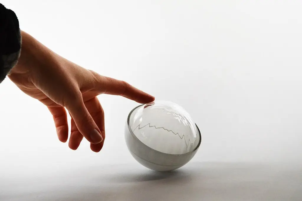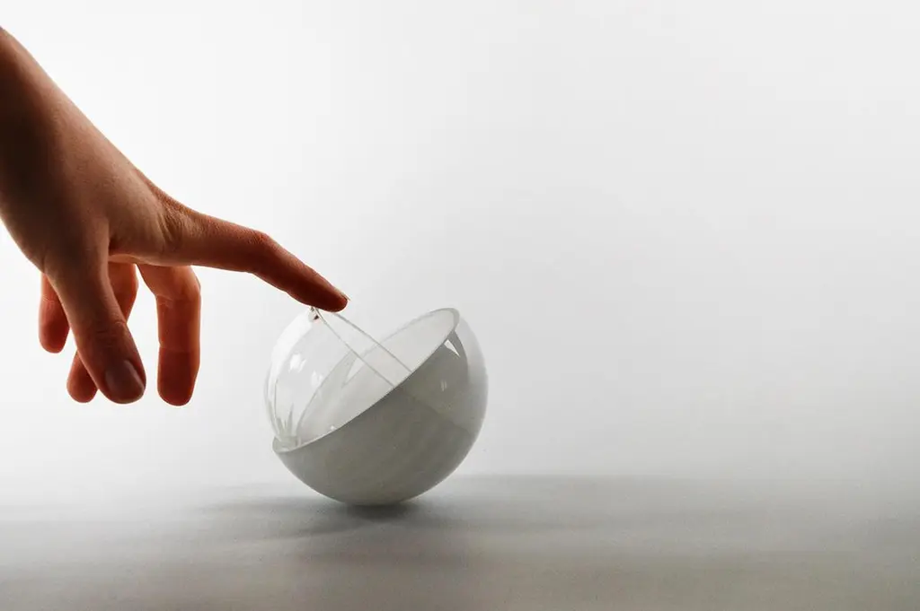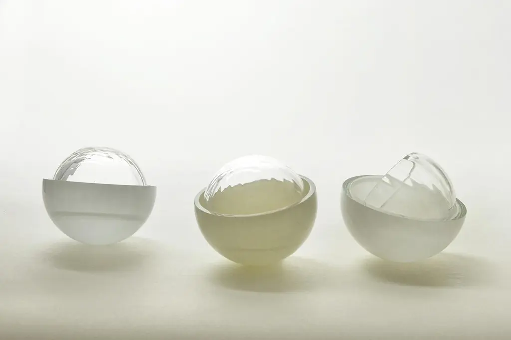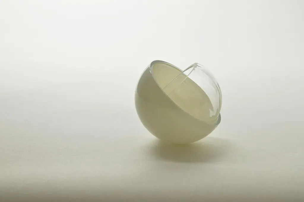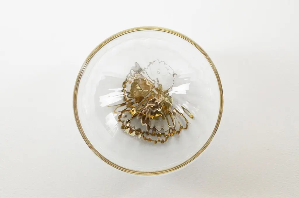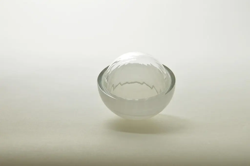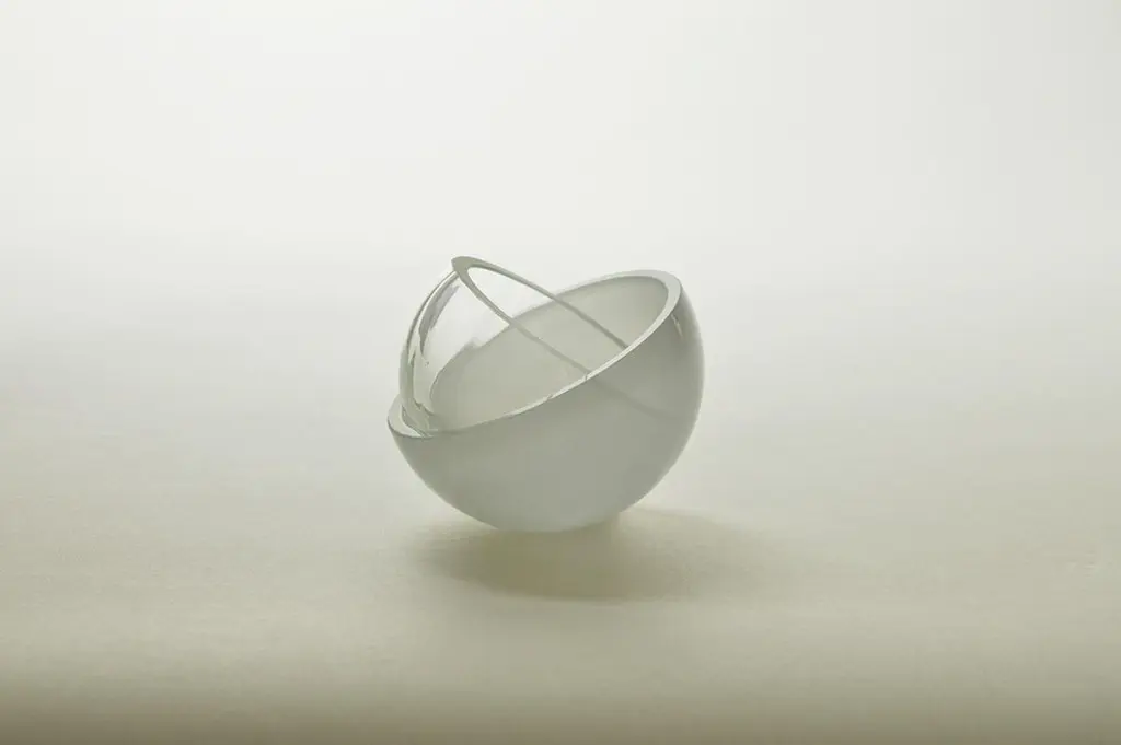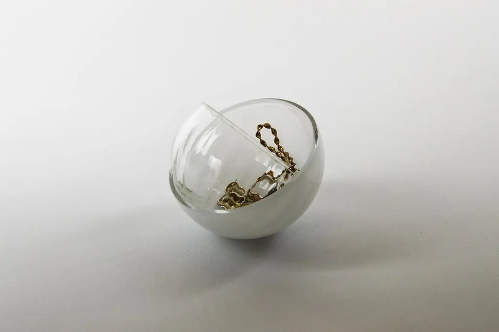 Unique jewelry box by Atelier GeorgeOne of a KindDimensions: Ø 90 cmMaterials: Handblown glassAlso available in ivory and light greyThe Moire collection is the result of a work on optical and transparency effects. It is named after the «moiré» patterns of certain fabrics like tulle, which is obtained by overlaying two similar printed or woven patterns. The observation of these wavy,iridescent patterns inspired the textures found in the collection. The color palette is beige, gray and blue, evoking stone or water.This collection forms the basis of our signature style, simple by design. It comprises light fixtures, tableware and interior accessories, all hand-made using hot glass crafting techniques.The Atelier George is a French design and glassblowing studio. Each piece is hand-made using hot glass crafting techniques. To bring you a set ofunique objects, the crafting process and the color finish makes every piece slightly different from the next.