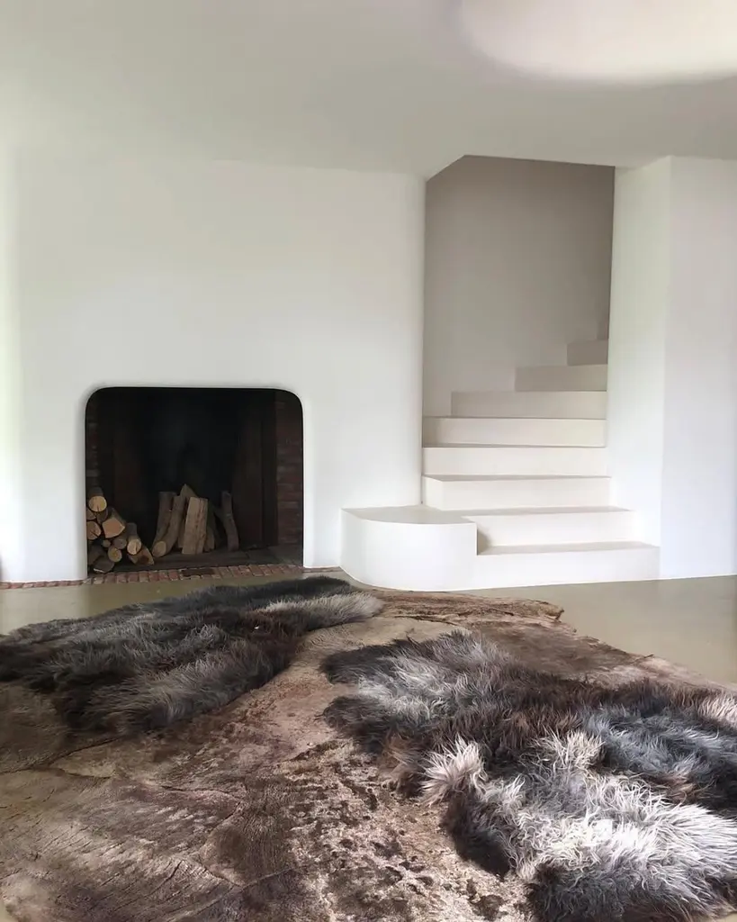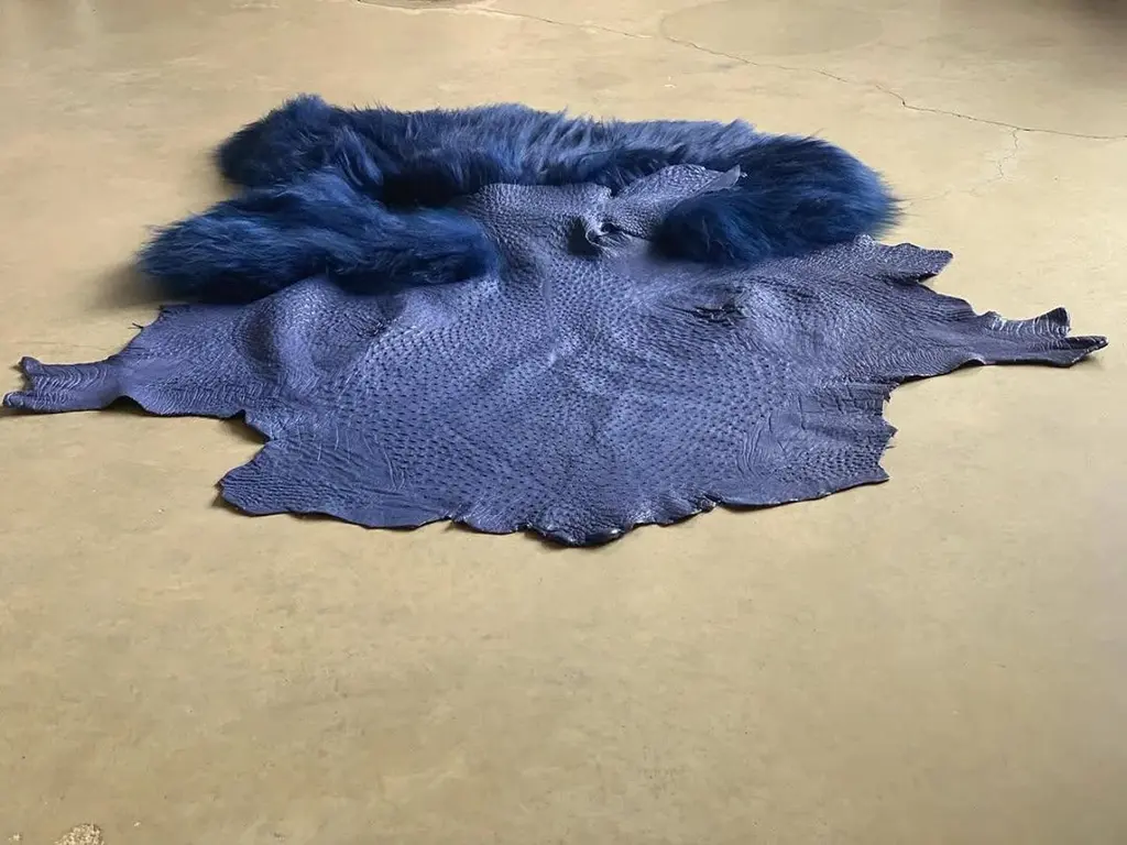Unique Organic Shape Hand-Dyed Blue European Sheepskin Small Rug by Carine BoxyDimensions: 210 x 130 cmMaterials: Naturally dyed sheepskin.Size and color can be customized upon request.Each rug is different and unique.Carine Boxy is internationally known for her artistic sheepskin rugs. Each piece is unique and hand-woven. Carine Boxy is a Belgian textile artist and designer based in Deurle. Each of her creations in naturally dyed sheepskin is unique and versatile (rug, cover, tapestry, …) and can be also seen as site specific to a residential or a hospitality project such as the restaurants by Sergio Herman. Her storytelling compositions are conceived as a patchwork quilt or carpet, a wall decoration, an object, a piece of furniture, with an extraordinary sense of tactility and wellbeing. The sheepskins bring – assembled together – the atmosphere of a wild life into the home. They reveal each one of a kind the true texture, appeal to the senses, thanks to their ultra soft material and a true combination of the hand and the heart. Carine has this attitude of the craftsman that creates from the sheepskin a human kind experience which brings the warmth in interiors.