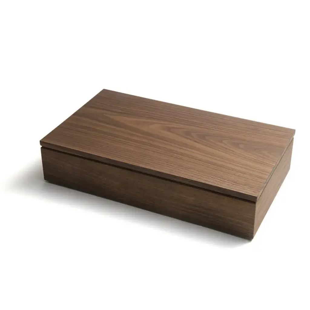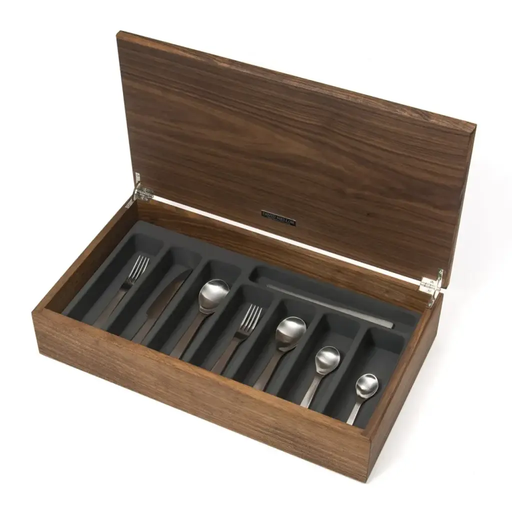 Made for David Mellor in a small specialist workshop. Corin Mellor's take on the traditional cutlery canteen is beautifully proportioned with fine chrome-plated hinges. Walnut box that comes with a specially shaped insert to hold up to 8 place settings of David Mellor City, London, Odeon, Provençal, Minimal or Café cutlery.
