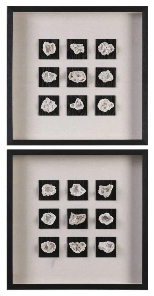 Authentic Geodes In Natural Hues Are Displayed On Black Woodgrain Matting Atop A Natural Linen Mat. A Black, Fir Wood Shadow Box Frame Completes The Display. Sizes And Shapes Of Geodes May Vary Slightly. Uttermost''s Wall Art Combines Premium Quality Materials With Unique High-style Design. With The Advanced Product Engineering And Packaging Reinforcement, Uttermost Maintains Some Of The Lowest Damage Rates In The Industry. Each Product Is Designed, Manufactured And Packaged With Shipping In Mind. DimensionsDepth: 2. 375 in. Width: 21. 625 in. Height: 21. 625 in.