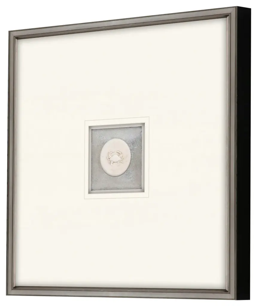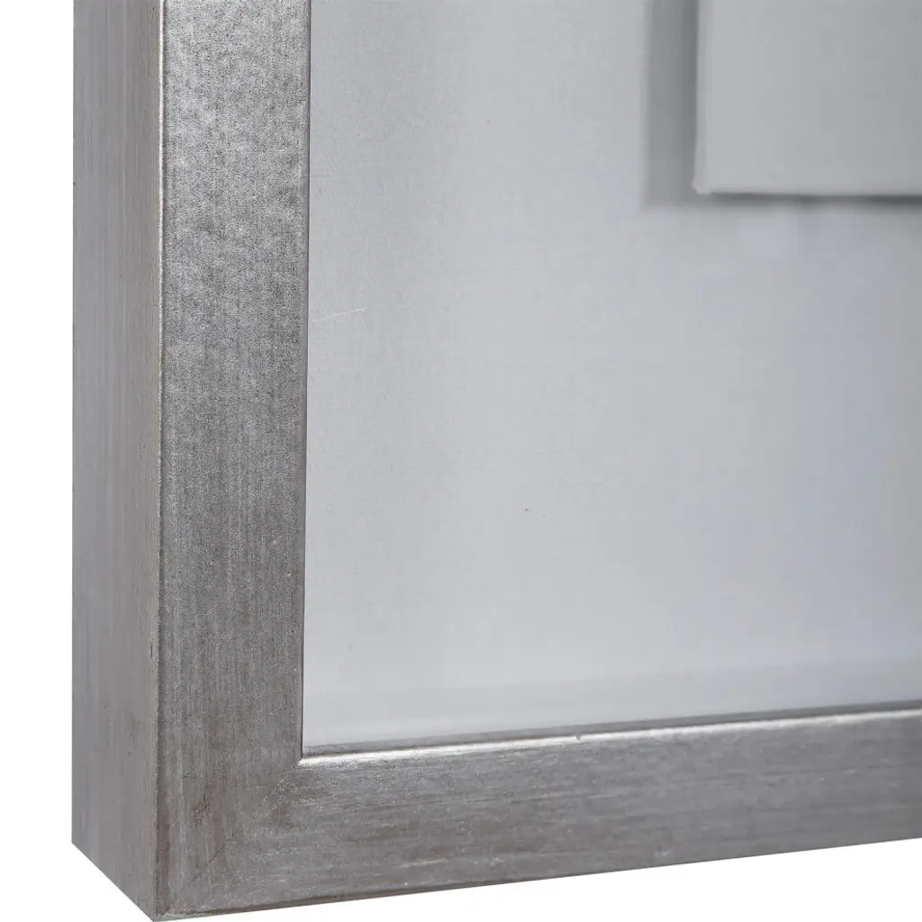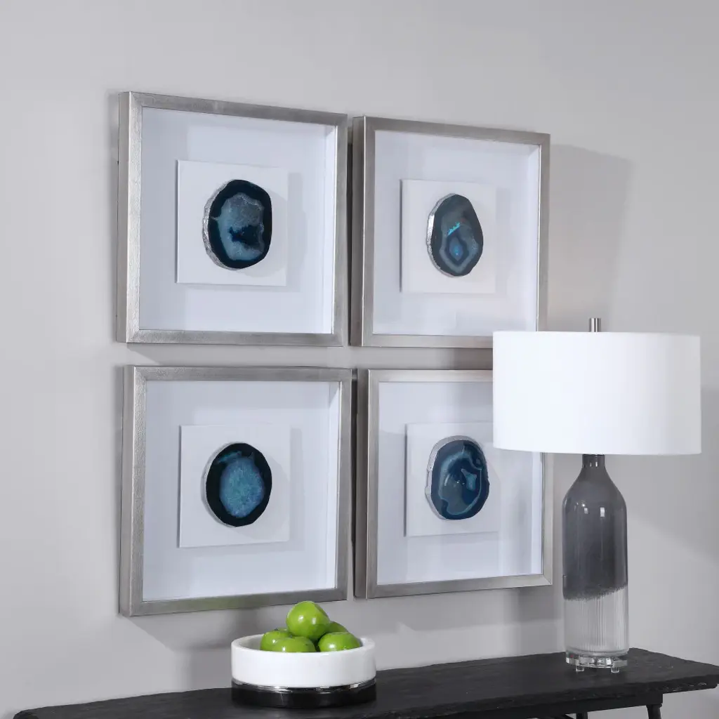 A Pine Wood Shadow Box Featuring A Hand Applied Silver Leaf Finish Showcases A Striking Blue Agate Stone With Light Blue Veining, Accented With Hand Painted Silver Edging. Mounted On A White Linen Backing.