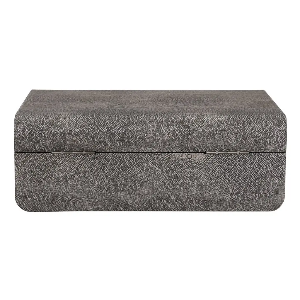 Elevate your decor with the Uttermost Lalique Art Deco Decorative Box. Measuring 9"D × 13"W × 5"H, this elegant accent showcases a faux smoke gray shagreen wrap accented by a brushed antique brass and black enamel closure. The interior is finished in matte black, providing a stylish space for storing small keepsakes or jewelry. Crafted from MDF (85%), PU fabric (10%), and other materials (5%), this indoor-only box designed by Matthew Williams brings Art Deco-inspired sophistication to consoles, nightstands, or desktops, complementing modern, classic, and transitional interiors. Key Benefits Art Deco Elegance: Faux shagreen and metallic accents bring vintage sophistication Functional Storage: Perfect for jewelry, trinkets, or keepsakes — 9"D × 13"W × 5"H Designer Detailing: Brushed brass and black enamel closure adds tactile, visual appeal Versatile Indoor Accent: Ideal for consoles, desktops, or nightstands