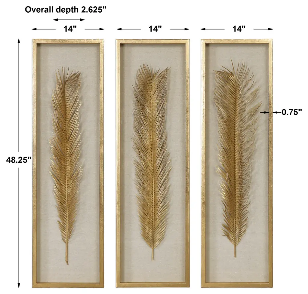 This Set Of 3 Shadow Box Art Features Gold Finished Sago Palm Leaf Replicas, Set On A Neutral Linen Background With Hand Applied Gold Leaf Frames.