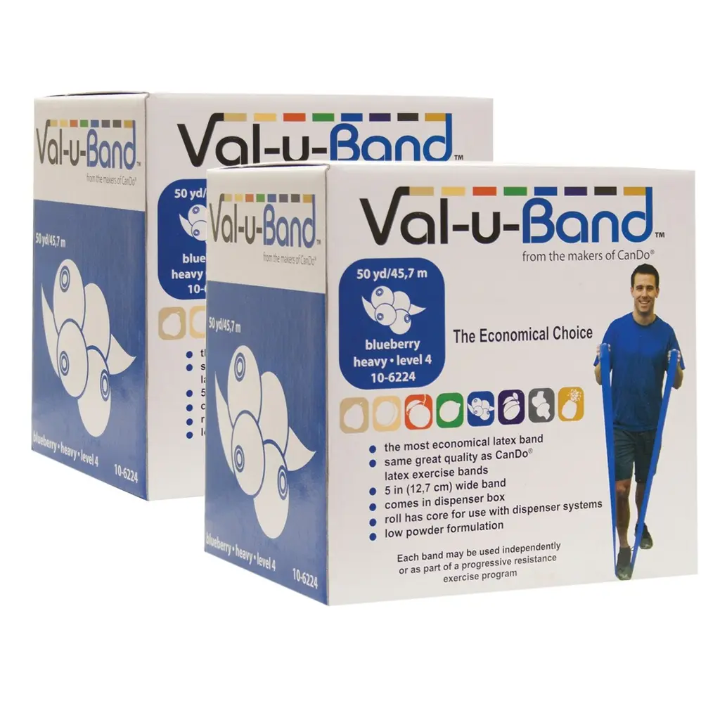 The Twin-Pak® has 100 yards of exercise band (2 x 50 yard rolls) and is the most cost effective way to outfit your facility. Low powder resistive exercise Val-u-Band® is color-coded in Berry Colors®. Low powder Val-u-Band® is an economical latex exercise band; same great quality as CanDo® latex exercise bands; 5" width band available in dispenser boxes; Available in 6 and 50 yard roll; 50 yard roll has core for use with dispenser systems. Levels range in order of resistance from least to greatest resistance: pear (0), peach (1), orange (2), lime (3), blueberry (4), plum (5), mushroom (6), pineapple (7). For those with latex sensitivities, there are latex-free alternative offerings of Val-u-Band® exercise band.While we aim to supply accurate product information, it is sourced by manufacturers, suppliers and marketplace sellers, and has not been provided by Overstock.