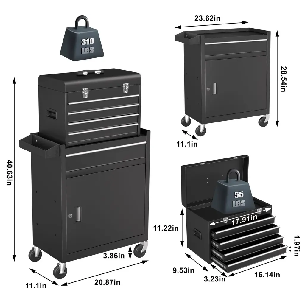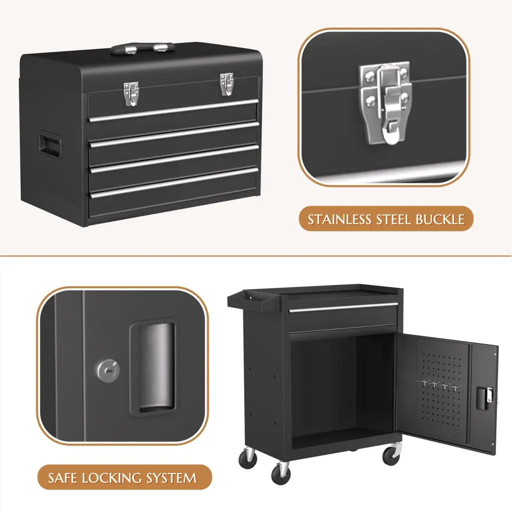 The tool car is made of metal steel, can be divided into top boxes and bottom tool cart, and has independent fastener. Classic color and unique appearance, lockable tool box can be the furniture of your home, garage, warehouse, store, etc. Also, if you move the top setting, you get a working table. Feature: